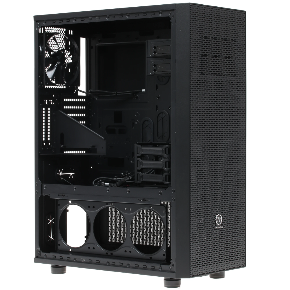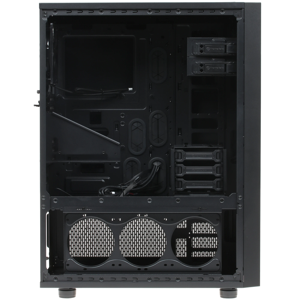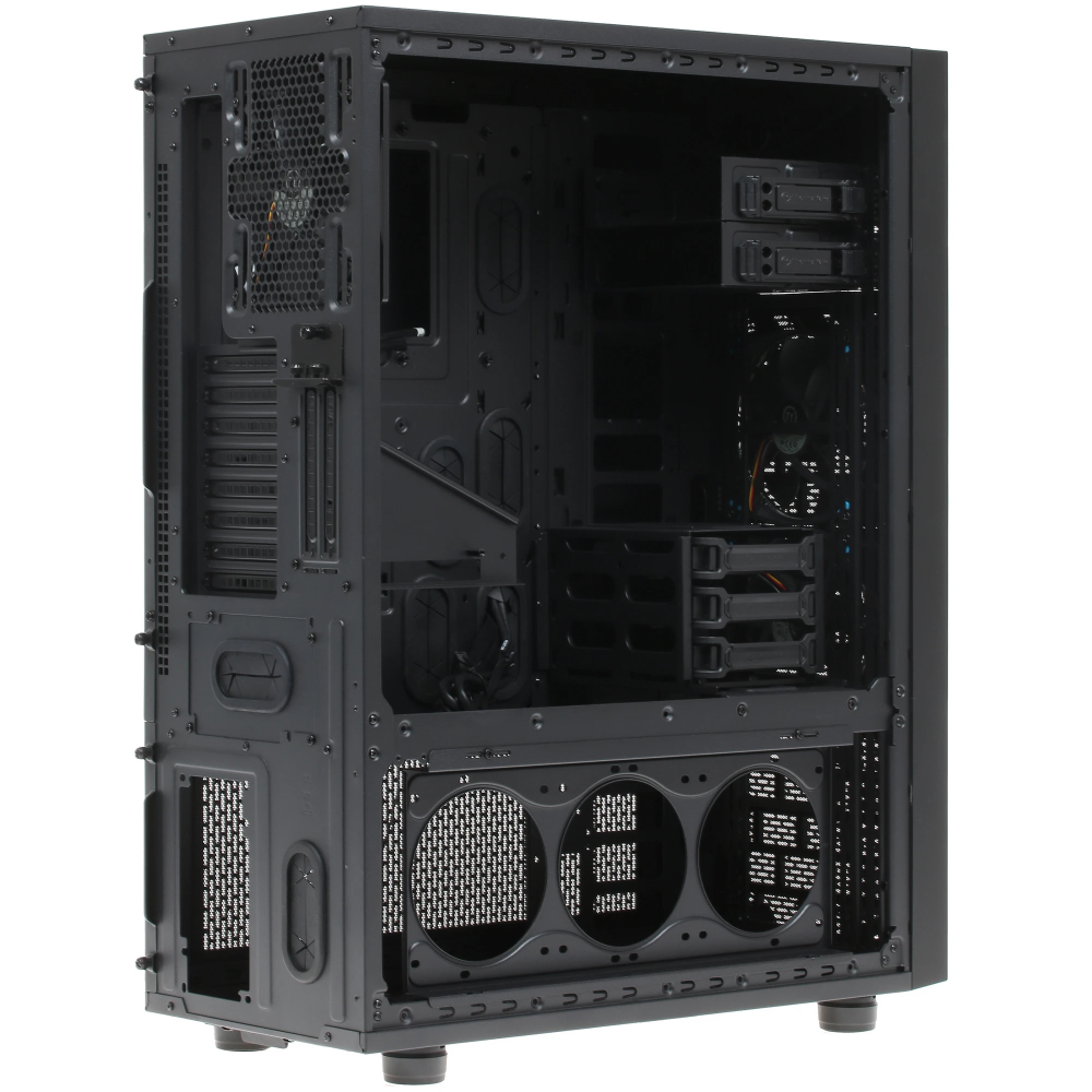 Корпус Thermaltake Core X71 TG типоразмера Full-Tower, выполненный в черном цвете, привлекает рядом удачных технических и дизайнерских решений. Передняя панель этой модели, предназначенной для постройки игровой машины на основе материнской платы Micro-ATX, Mini-ITX или Standard-ATX, изготовлена в виде решетки для большей эффективности работы фронтальных вентиляторов. Боковое окно из закаленного стекла способствует удобству наблюдения за работой компонентов системы и позволяет насладиться эффектным видом встроенной подсветки с голубыми светодиодами.