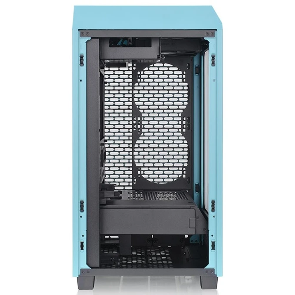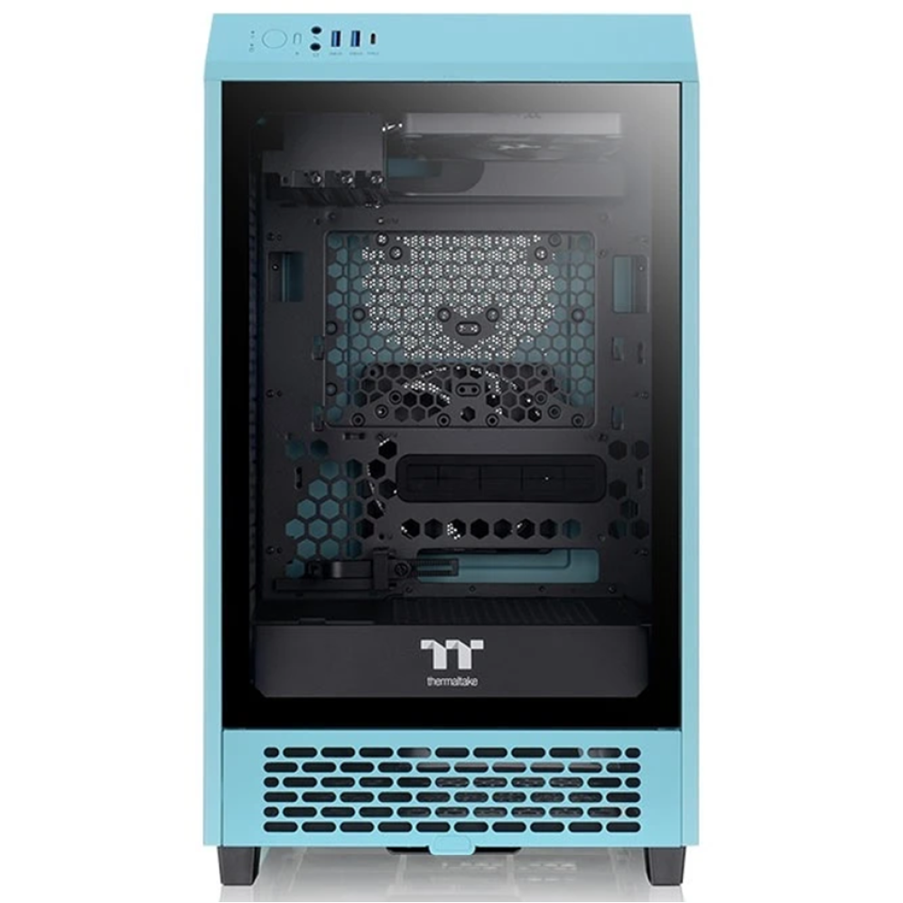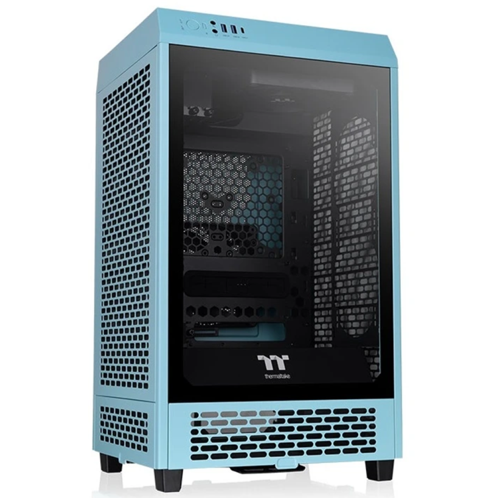 Корпус Thermaltake The Tower 200 Turquoise бирюзового цвета имеет оригинальный дизайн и компактные размеры. Его конструкция предполагает сборку производительного игрового ПК. На стальном корпусе есть перфорация для улучшения вентиляции всех элементов ПК. Лицевая панель из закаленного стекла позволяет увидеть внутреннее оформление ПК с RGB-подсветкой. В корпусе есть место для видеокарты длиной до 380 мм. Чтобы исключить ее подвижность, используется специальный стабилизатор.