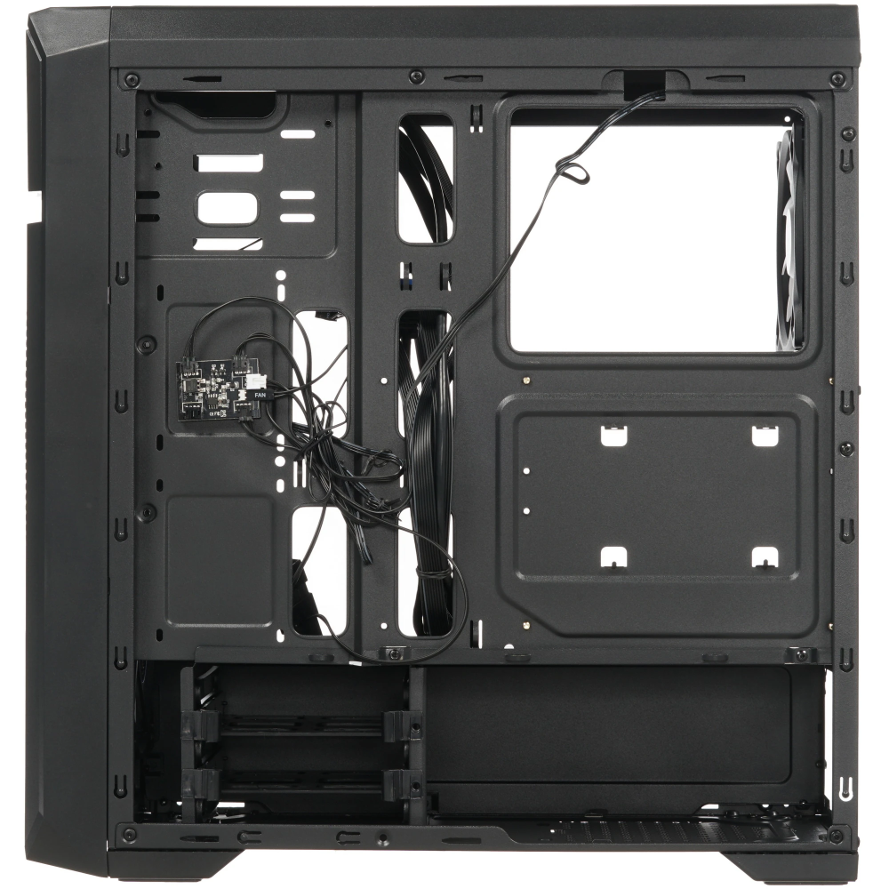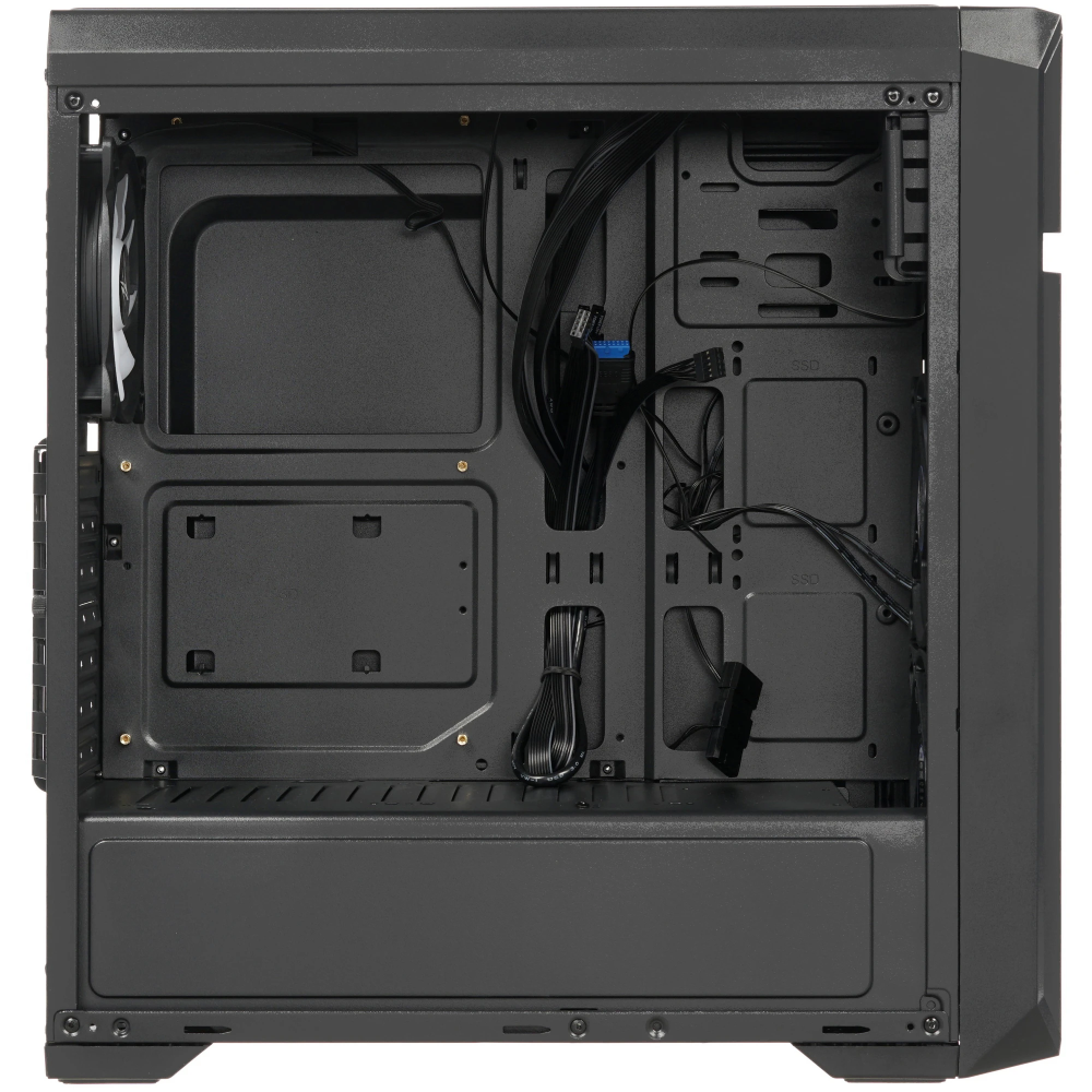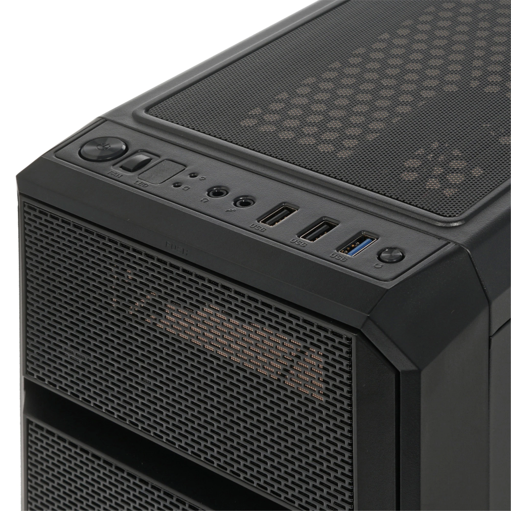 Корпус ZALMAN N5 OF обращает на себя внимание оригинальной конструкцией передней панели и обилием перфорированных элементов. Боковую стенку занимает окно из устойчивого к внешним воздействиям оргстекла. Модель имеет эффектную белую подсветку. Цвет корпуса традиционный – черный.