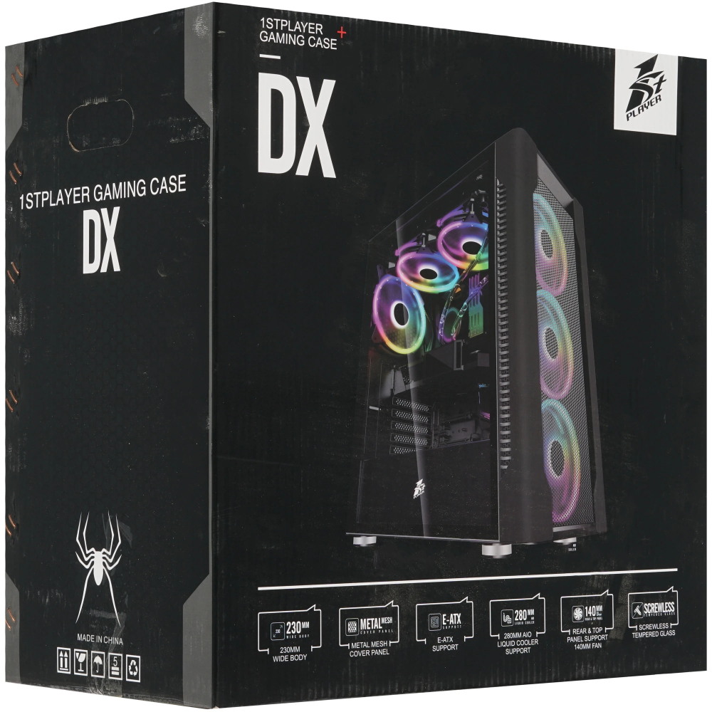 В корпус 1STPLAYER DK DX (DX-SL-M1-PLUS) формата Midi-Tower можно устанавливать материнские платы типа E-ATX, Micro-ATX, Mini-ITX, Standard-ATX. Конструкция изготовлена из стали толщиной 0.6 мм, а лицевая панель – из закаленного стекла. К особенностям модели относится быстрый доступ к 3 кулерам, имеющимся в конструкции, и возможность вертикальной установки карт расширения. Блок питания располагается снизу. Многоцветная подсветка ARGB обеспечивает корпусу 1STPLAYER DK DX (DX-SL-M1-PLUS) эффектный внешний вид. Особенно это оценят геймеры и киберспортсмены.