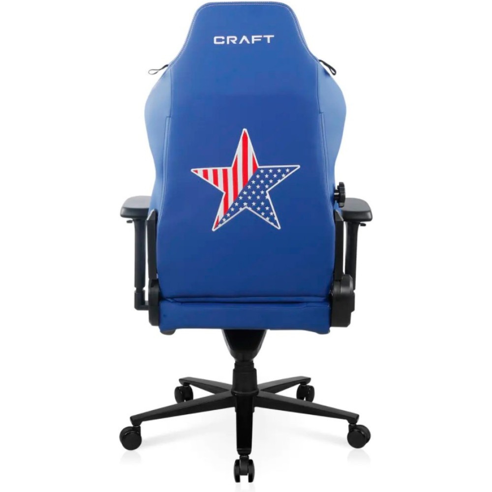 Геймерское кресло Craft America Edition. Обивка изготовлена из эко-кожи, а расположение синего, белого и красного цветов удивительным образом напоминает хорошо знакомый звездно-полосатый флаг Америки. Регулировка наклона спинки осуществляется на угол до 150 градусов, а подлокотники кресла обладают 4D регулировкой.