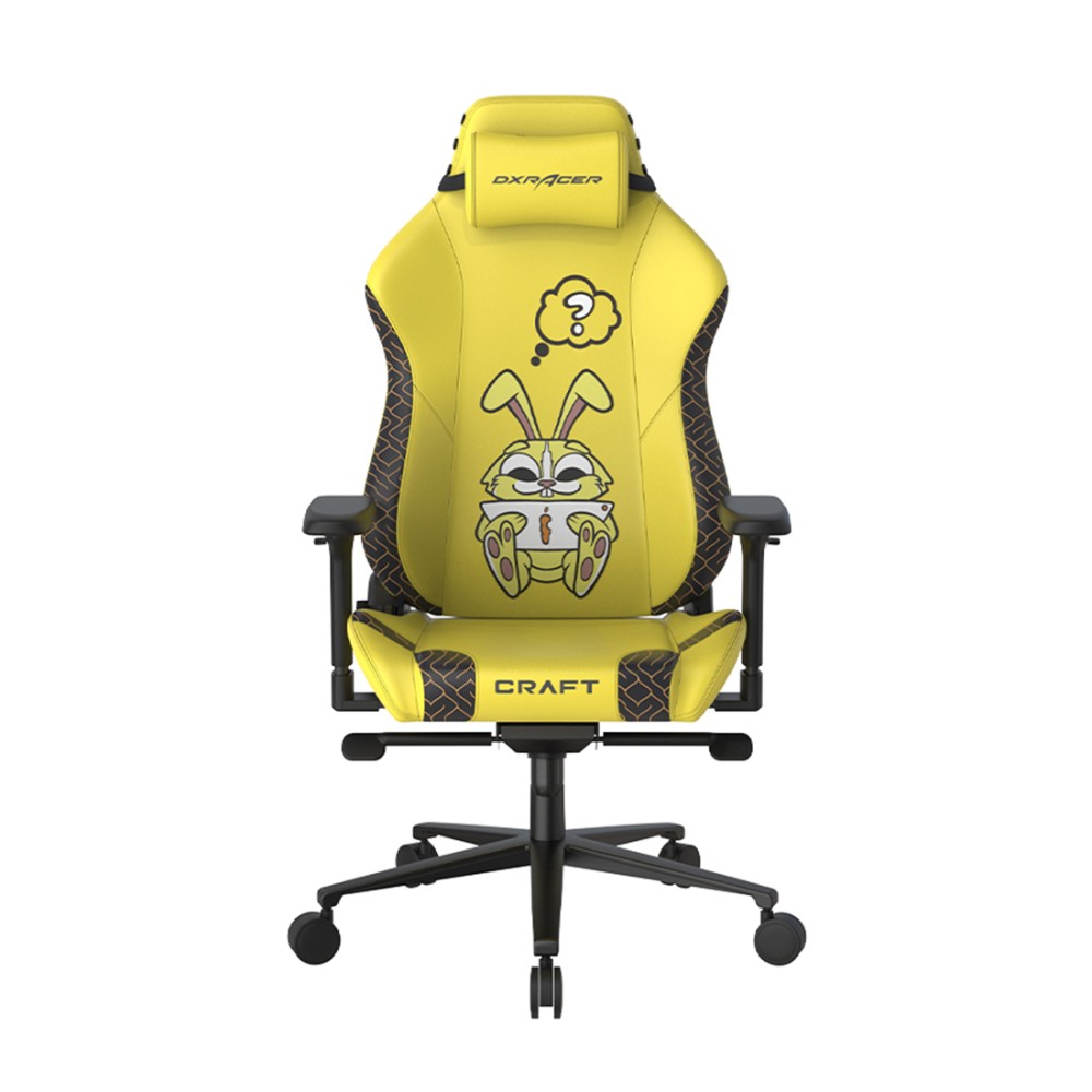 Ярко-желтое компьютерное кресло DXRacer Craft. Обивка выполнена из эко-кожи, а на спинке кресла вышито изображение милого и пушистого создания - кролика. Плавное качание кресла осуществляется при помощи механизма мультиблок, а подлокотники обладают 4D регулировкой.