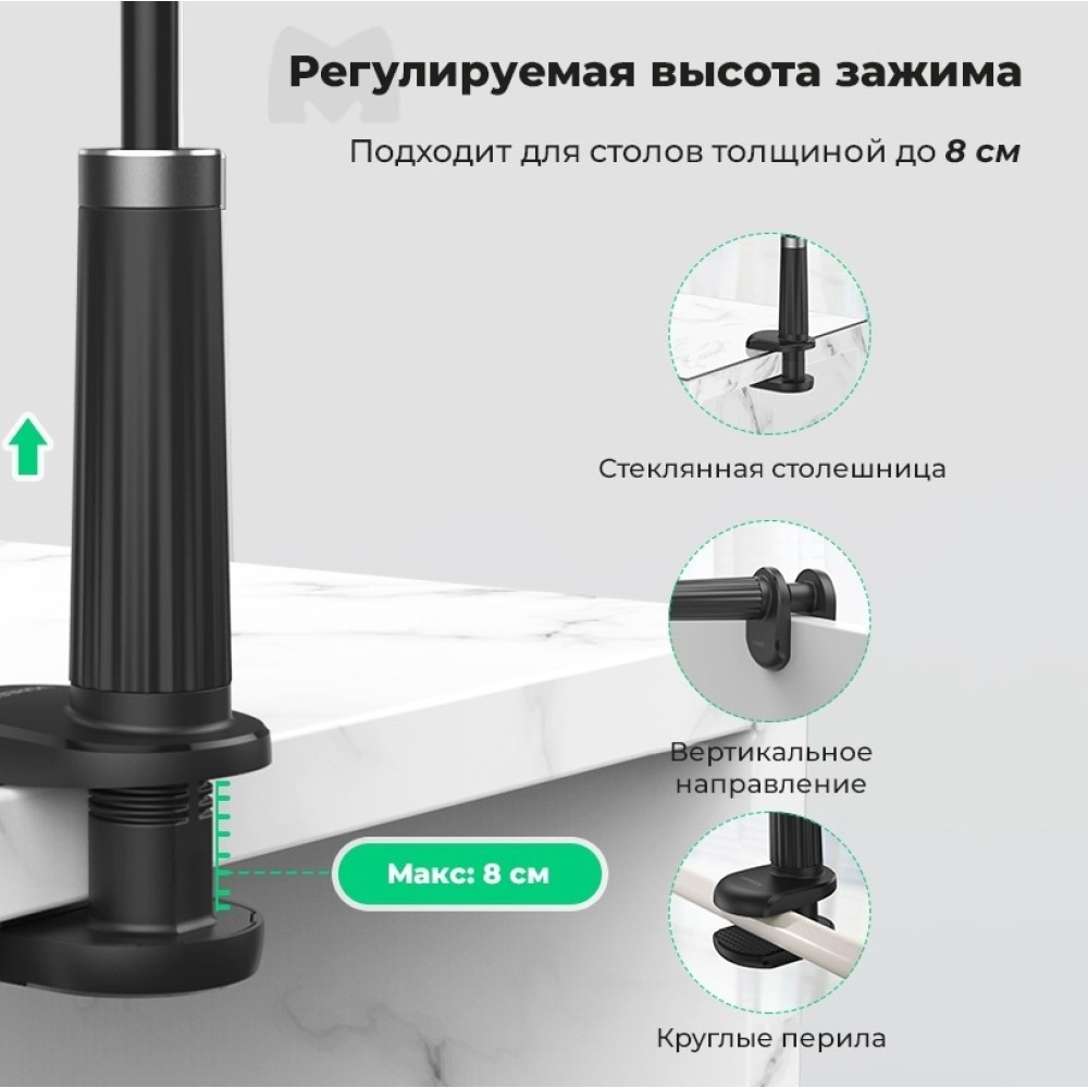 Держатель телефона UGREEN на гибкой шее с зажимом позволяет легко поворачивать его длинный рычаг в нужное положение, спасая вас от болей в шее.