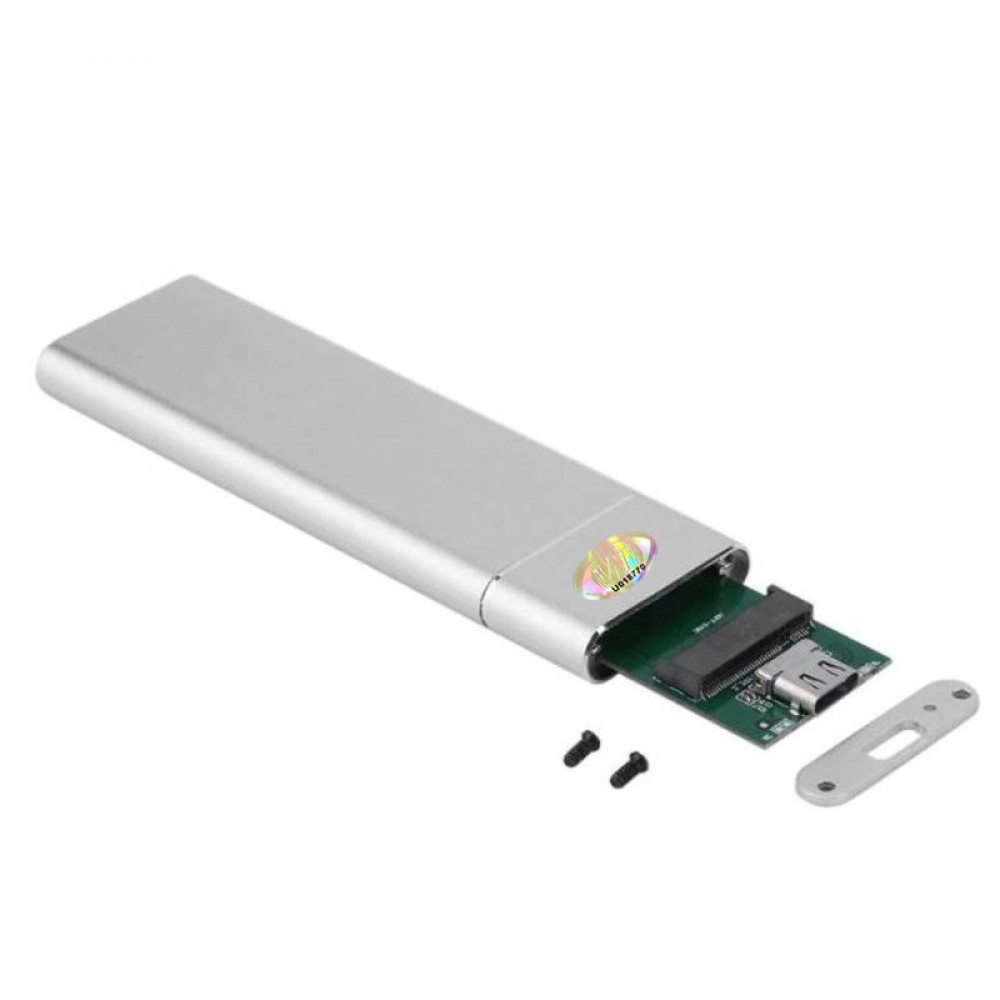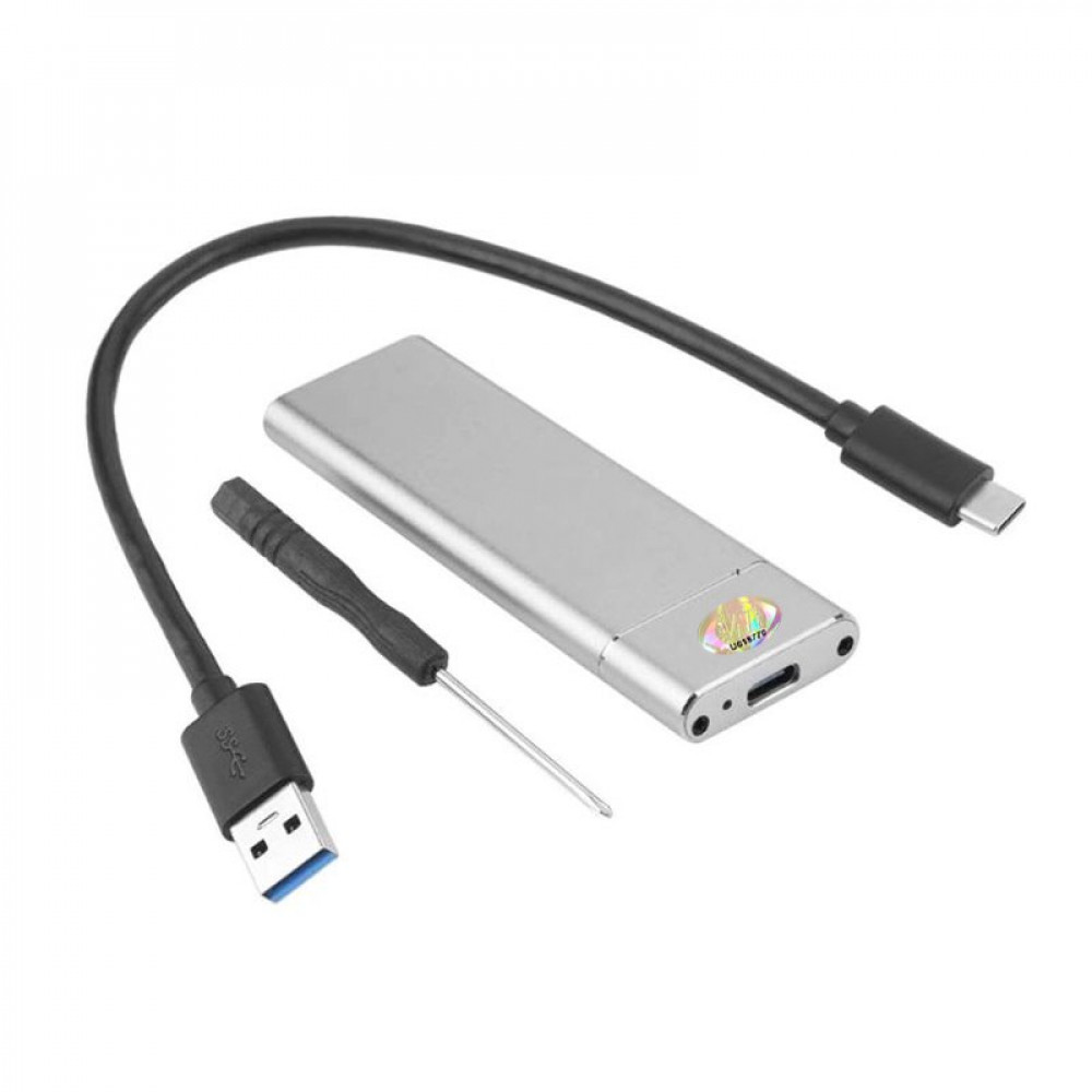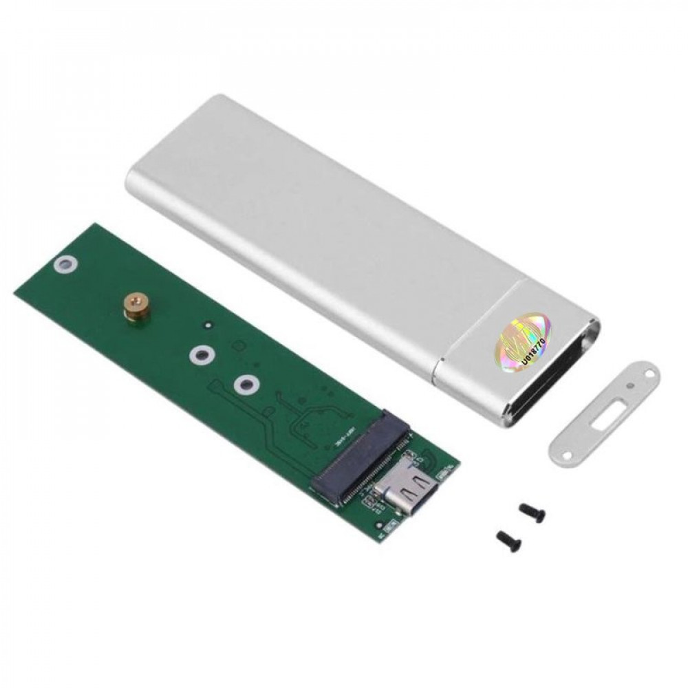 В комплект входят корпус для диска M.2, отвертка, кабель USB 3.0 на USB Type-C и монтажные винты. Корпус выполнен в серебристом цвете и обладает компактными размерами, что делает его удобным для переноски и ежедневного использования.