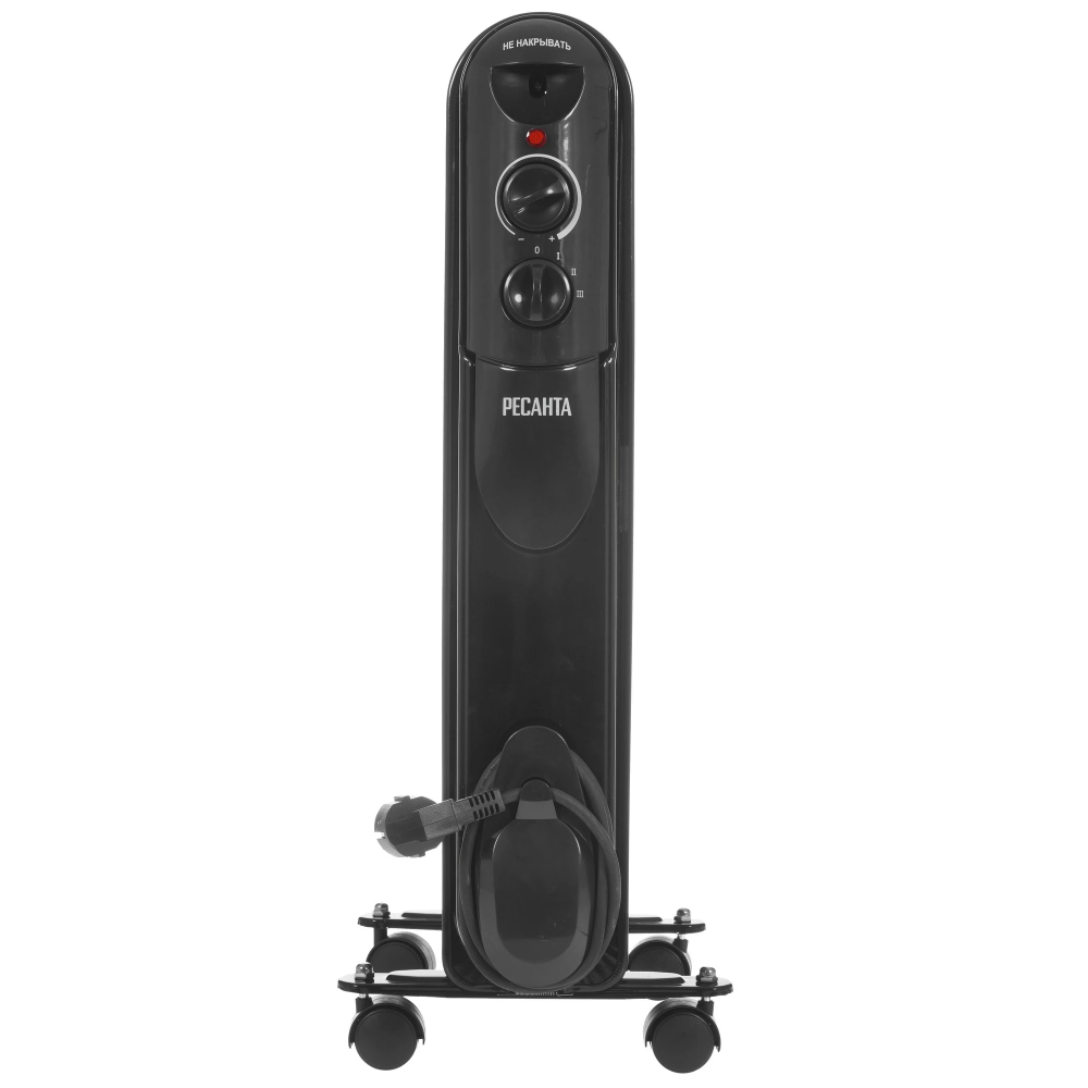 Конструкцией Ресанта ОМПТ-9НЧ предусмотрено 9 секций, наполненных маслом. При воздействии элемента нагрева масло нагревается до определенной температуры, отдавая воздуху тепло. Внешняя часть корпуса сохраняет невысокую температуру, поэтому прибор почти не выжигает кислород. Устанавливается обогреватель на колесики, поэтому его легко перемещать по любому напольному покрытию. Дополнительно прибор оснащается ручкой. Для сматывания шнура предусмотрено специальное место на боковой стороне корпуса.