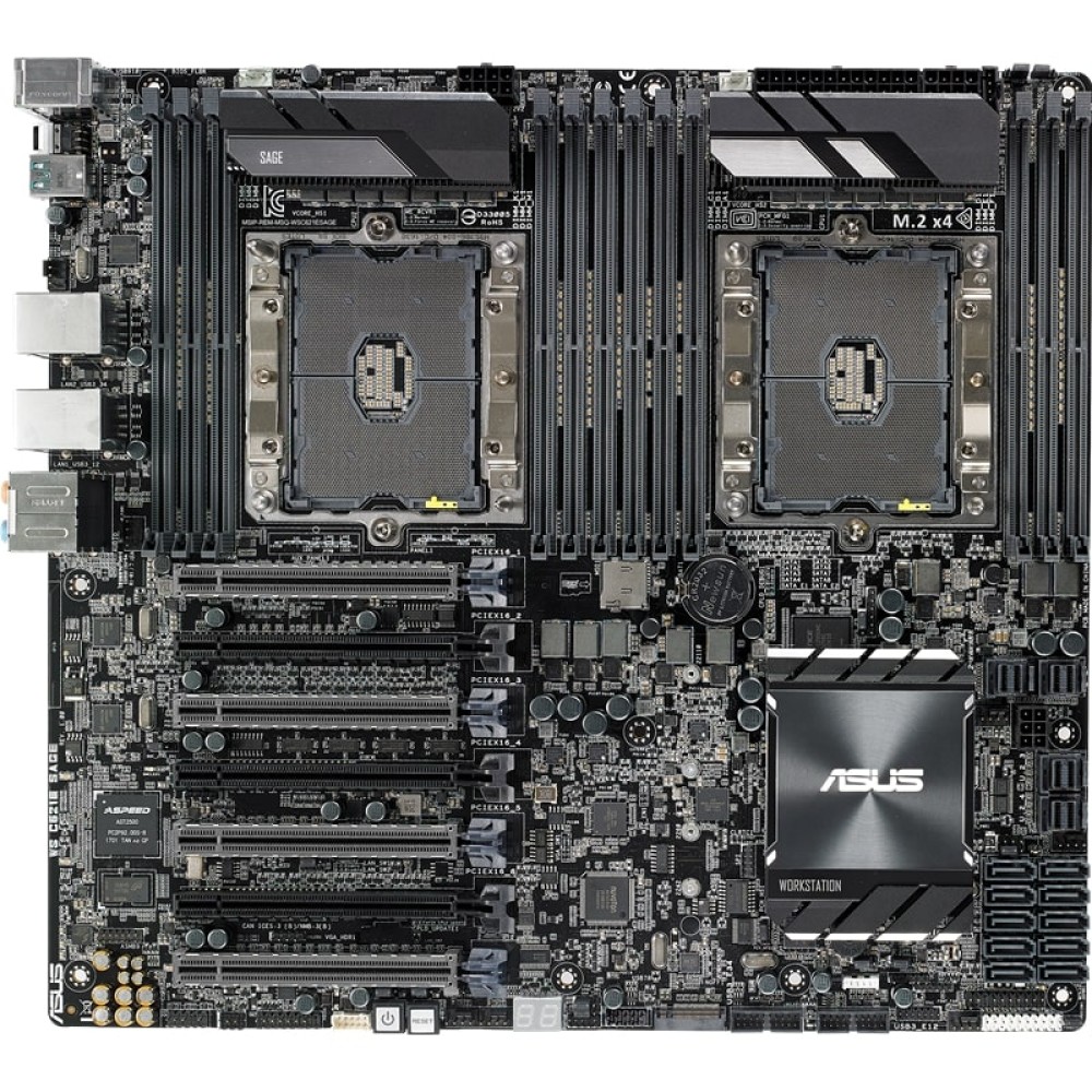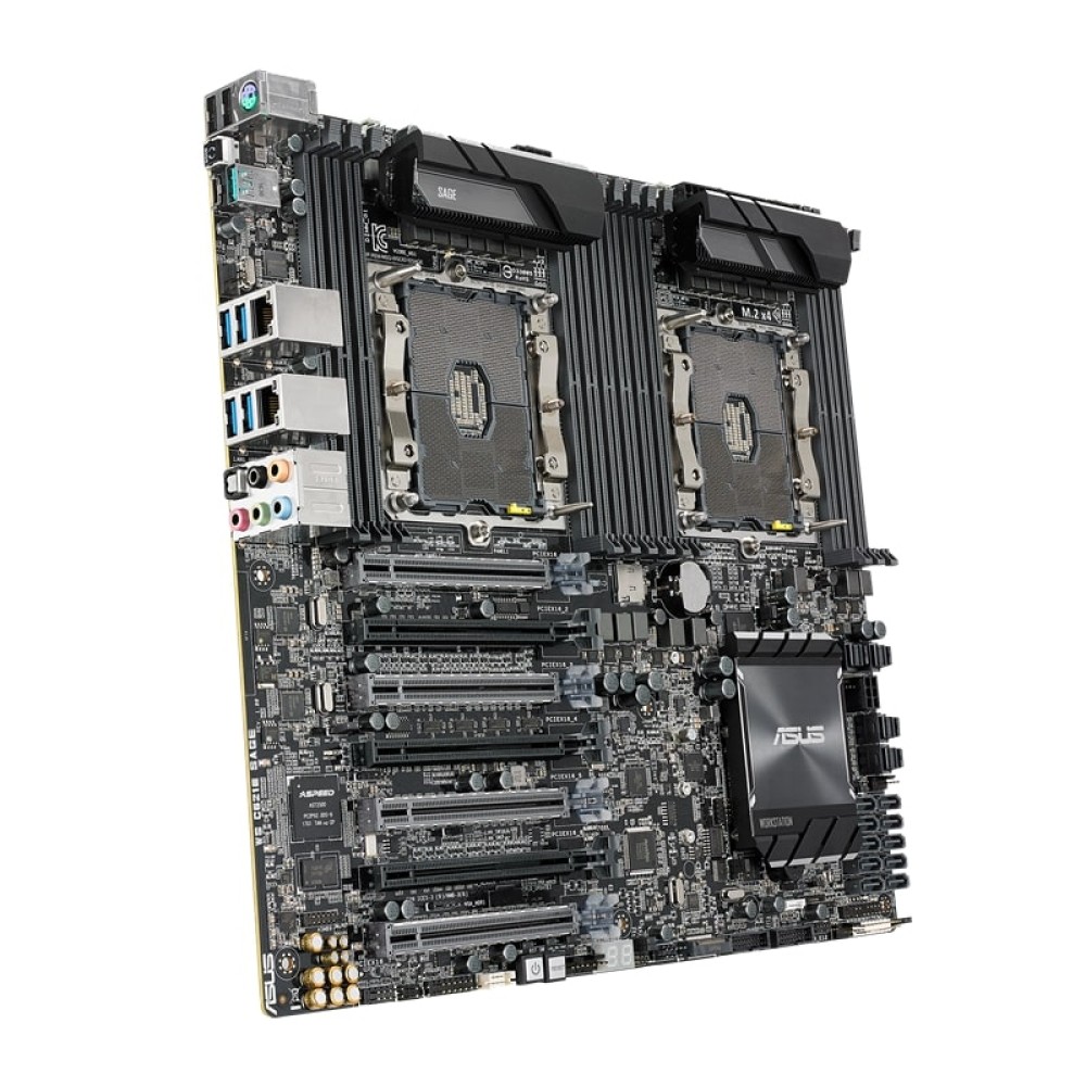 Материнская плата ASUS WS C621E SAGE соответствует типоразмеру SSI EEB, отличаясь габаритами 305x330 мм, и представляет собой полнофункциональное решение для постройки мощной рабочей станции или серверной машины с обширными возможностями. Она характеризуется совместимостью с ЦПУ производства Intel на сокете LGA 3647. Наибольший общий объем поддерживаемой платой оперативной памяти DDR4 LRDIMM/RDIMM может составлять 768 ГБ. Для присоединения планок ОЗУ с тактовой частотой 2400-2666 устройство предоставляет 12 слотов.