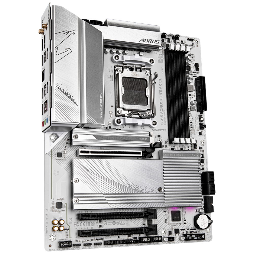 Материнская плата GIGABYTE B650 AORUS ELITE AX ICE – модель игрового уровня с инженерными решениями и фирменными технологиями для достижения высокой производительности. Она выделяется массивными охлаждающими радиаторами с фирменным логотипом серии и многоцветным программируемым освещением RGB. Плата предлагает 4 разъёма для размещения модулей DDR5, поддержку процессорного сокета AM5, слоты расширения PCI-E x16 для графических карт, 3 разъема M.2 и 4 слота SATA для запоминающих устройств.