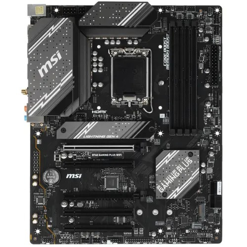 Материнская плата MSI B760 GAMING PLUS WIFI создана для геймеров и настроена на достижение высокого вычислительного потенциала. Она совместима с процессорами Alder Lake и Raptor Lake от производителя Intel. Плата оборудована 4 слотами DIMM, которые позволяют задействовать до 192 ГБ оперативной памяти поколения DDR5. Наличие 5 слотов расширения PCI-E x16 предусматривает создание графической системы из нескольких видеокарт. При помощи 2 разъемов M.2 и 6 портов SATA можно создать вместительное хранилище для игр, мультимедийных файлов, программ и документов.