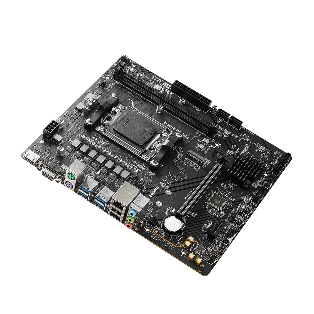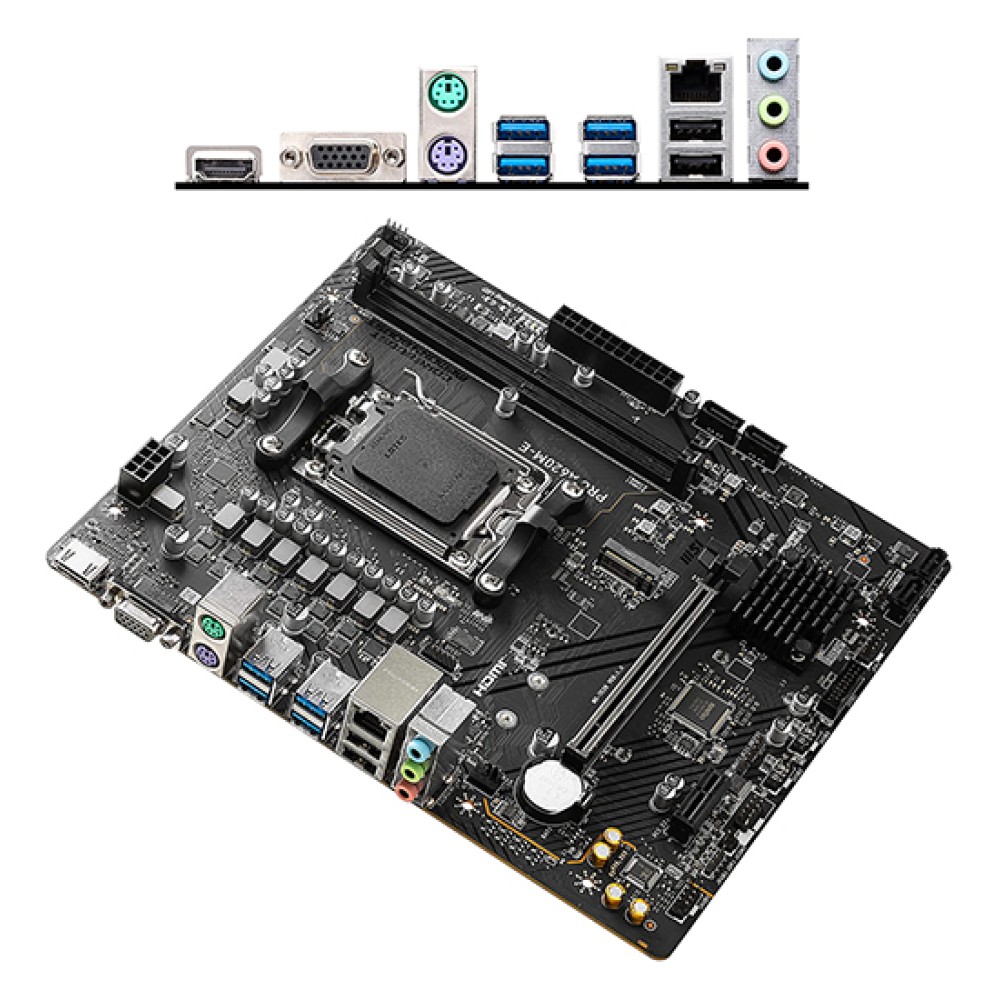 С помощью 1 разъема M.2 и 4 слотов SATA можно создать вместительную систему хранения файлов с использованием накопителей HDD/SSD. MSI PRO A620M-E оборудована сетевым адаптером со скоростью 1 Гбит/с для проводного соединения с Интернетом. На панели с интерфейсами расположены видеовыходы HDMI и VGA, порты USB и PS/2 для периферийных устройств, аудиоразъемы.