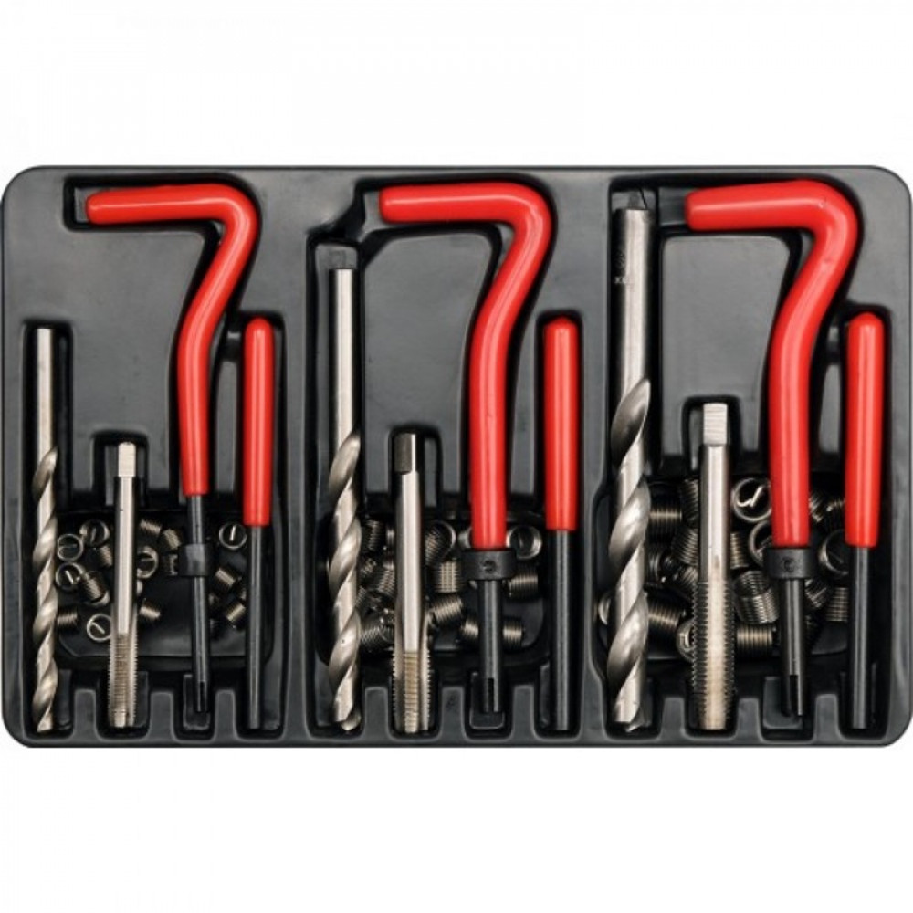 Профессиональный набор для восстановления повреждённой внутренней резьбы в диапазоне М6–М10. В комплект входят сверла, одноступенчатые метчики и спиральные вставки из нержавеющей стали. Спиральные вставки устанавливаются с помощью направляющей ручки и пуансона, который отламывает выступающий конец вставки. Набор предназначен для ручного восстановления резьбы в различных металлических конструкциях.