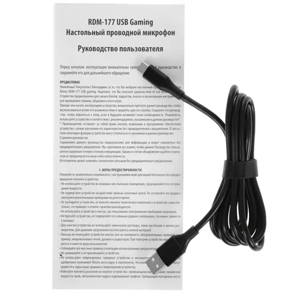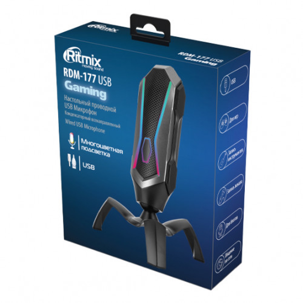 Корпус Ritmix RDM-177 изготовлен из высококачественного пластика и металла, отличается высокой надежностью и обладает стильным дизайном с яркой настраиваемой подсветкой. Модель оснащена устойчивой 3-осевой опорой и предназначена для настольного размещения. Для подключения модели к устройствам используется длинный кабель с портом USB-C на конце.