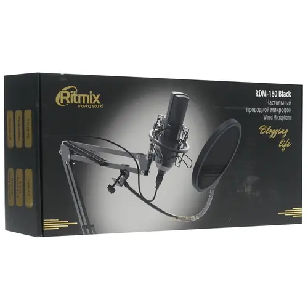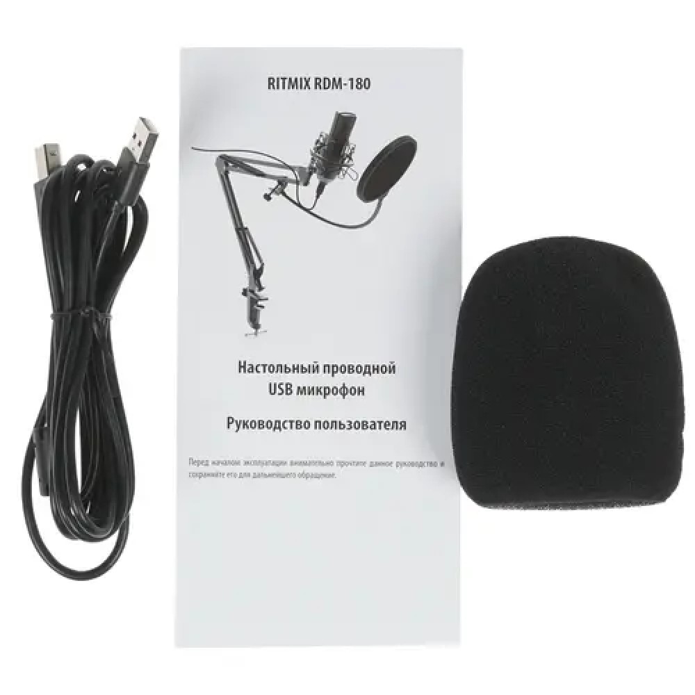 Микрофон RITMIX RDM-180 обладает чувствительностью на уровне -38 дБ и максимальным звуковым давлением 96 дБ. Минимальная частота, которую может уловить для воспроизведения устройство, составляет 30 Гц, а максимальная – 18000 Гц. Проводное подключение осуществляется при помощи специального кабеля USB длиной 2.5 м. В комплекте также поставляется поп-фильтр, ветрозащита и антивибрационный подвес.