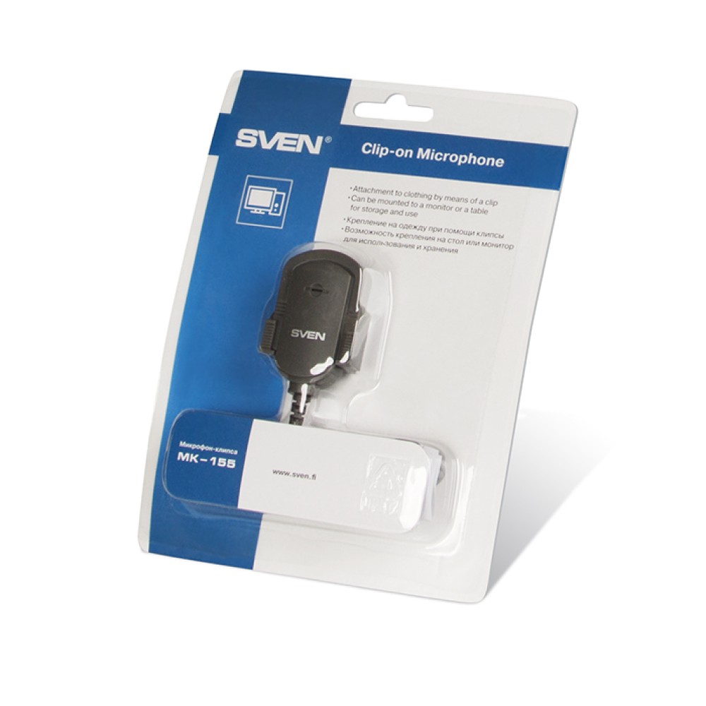 SVEN MK-155 имеет клипсу, с помощью которой микрофон крепится на одежду, а также съемный крепеж, предназначенный для фиксации модели на столе или на корпусе монитора. Таким образом, пользователь может освободить себя от лишних проводов и полностью сконцентрироваться на общении