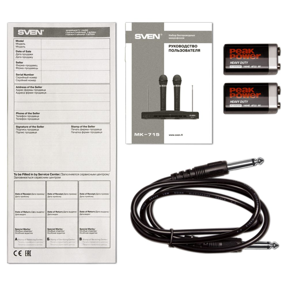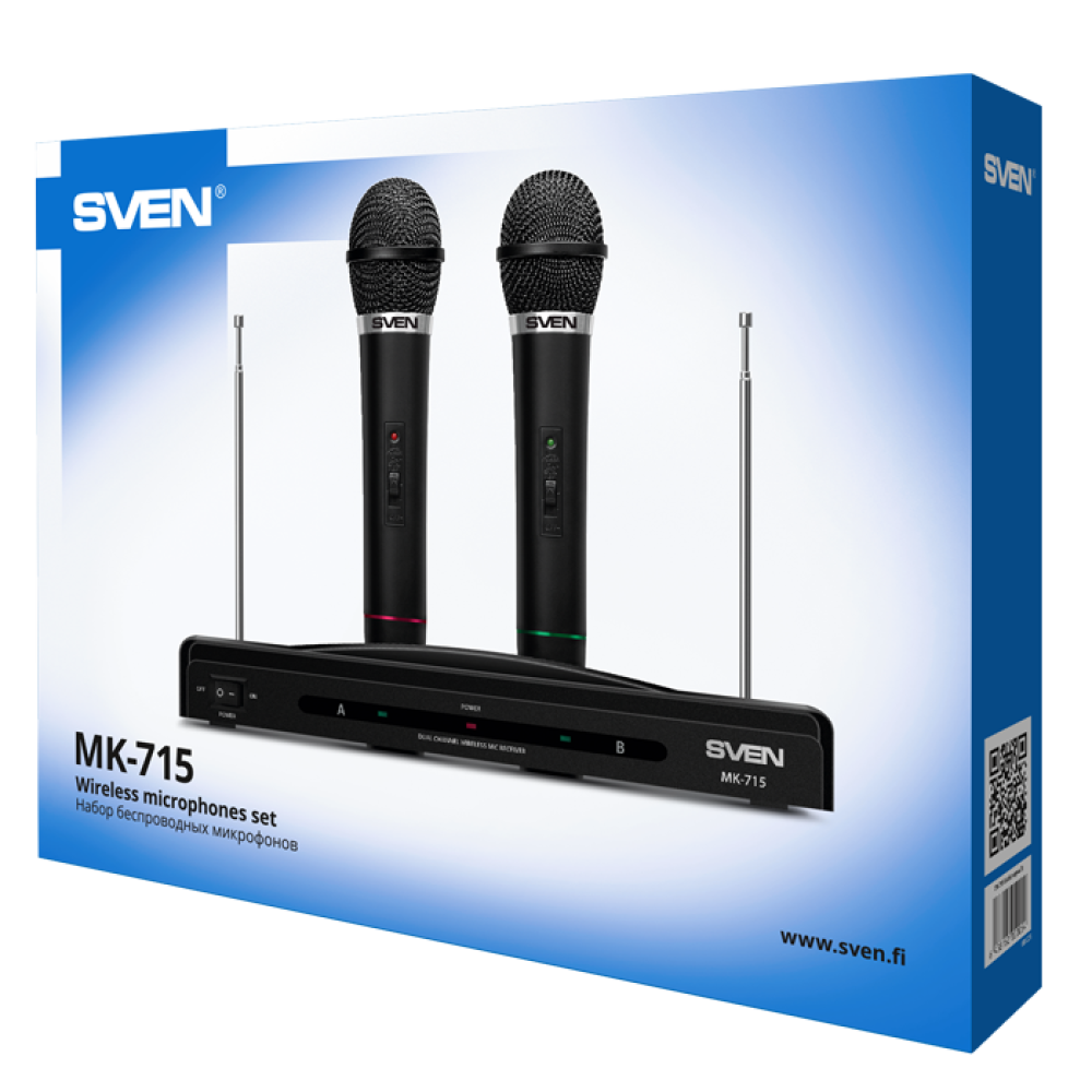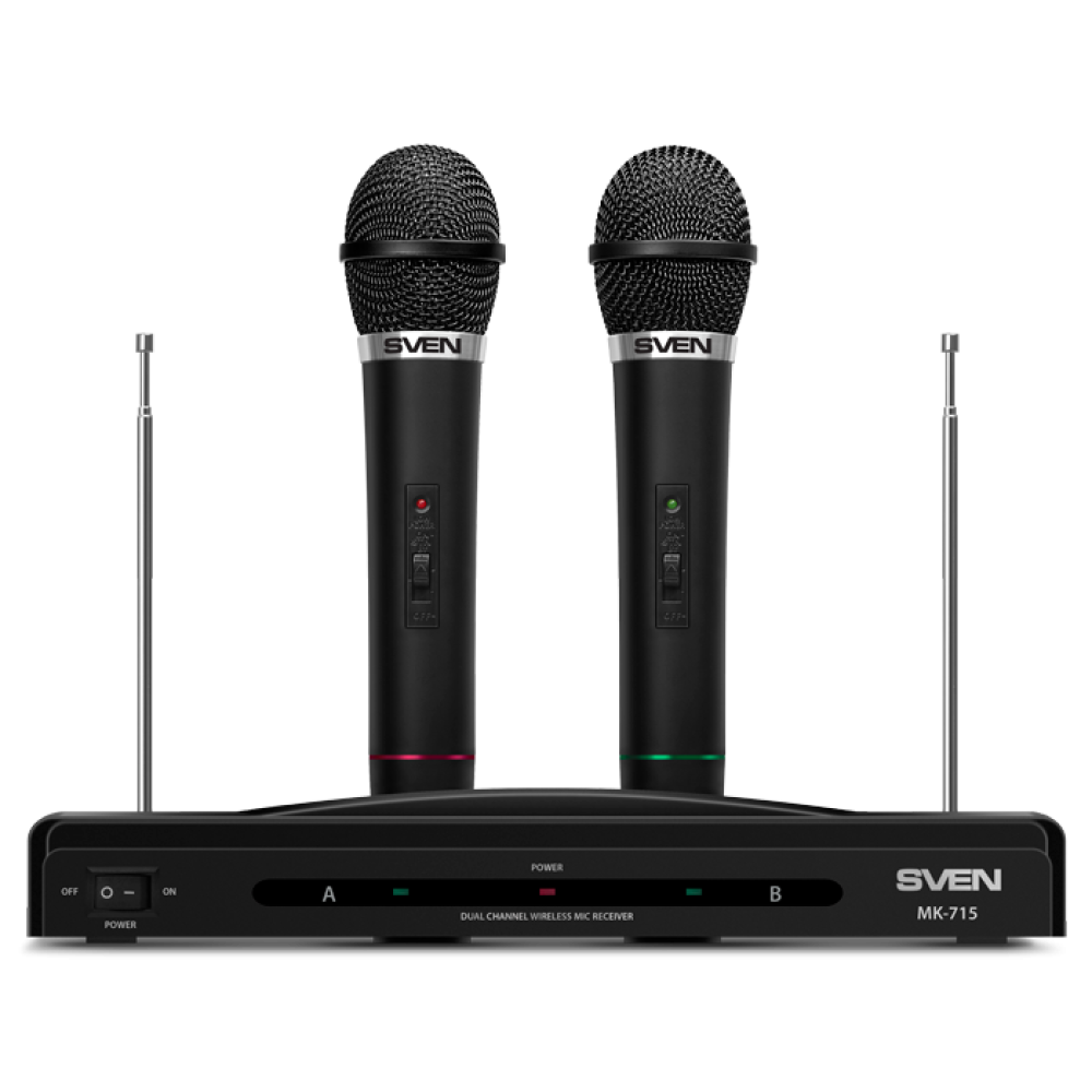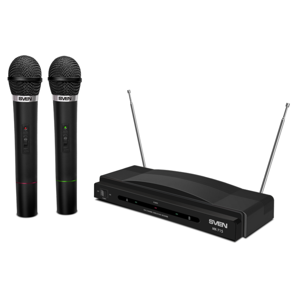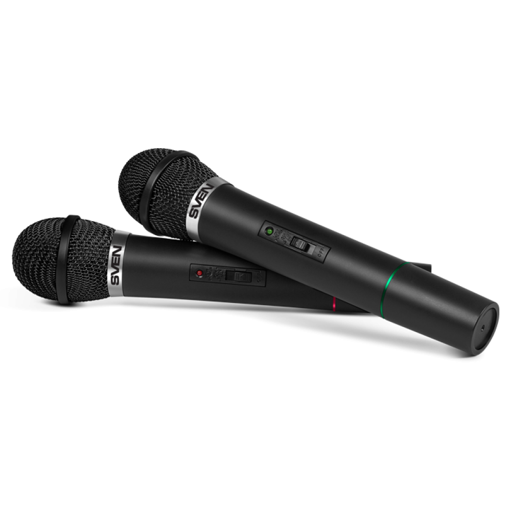 Микрофонный комплект SVEN MK-715 позволяет проводить досуг за караоке, а также подходит для записи звука и выступлений. В наборе поставляются 2 динамических всенаправленных микрофона, которые обеспечивают создание чистого естественного голоса без посторонних шумов. Для подключения микрофонов используется беспроводной радиопередатчик с дальностью действия 30 м (ресивер с антенной). Микрофоны выполнены в прочном пластиковом корпусе и оснащены кнопкой отключения на рукоятке. Автономная работа микрофонов SVEN MK-715 осуществляется за счет использования батареек 6F22.