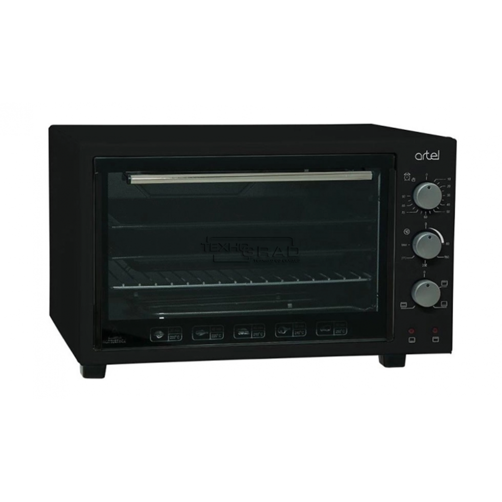 Электропечь ARTEL MD 3618 Е выполнена в компактном черном корпусе с духовкой объемом 36 л. На ее направляющие устанавливается прямоугольный противень и решетка, на которую можно поставить круглый противень. Все эти аксессуары идут в комплекте с прибором. На передней панели справа от дверцы находятся три поворотные ручки ‒ для настройки времени таймера, режима нагрева и температуры. Особенность печи в поддержке максимальной температуры 300 градусов.