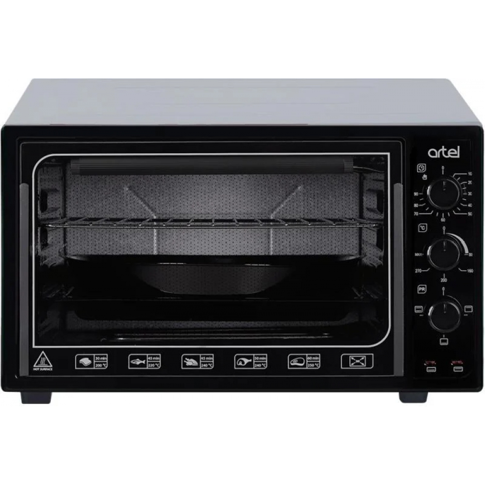 Электропечь ARTEL MD 3618 Е выполнена в компактном черном корпусе с духовкой объемом 36 л. На ее направляющие устанавливается прямоугольный противень и решетка, на которую можно поставить круглый противень. Все эти аксессуары идут в комплекте с прибором. На передней панели справа от дверцы находятся три поворотные ручки ‒ для настройки времени таймера, режима нагрева и температуры. Особенность печи в поддержке максимальной температуры 300 градусов.