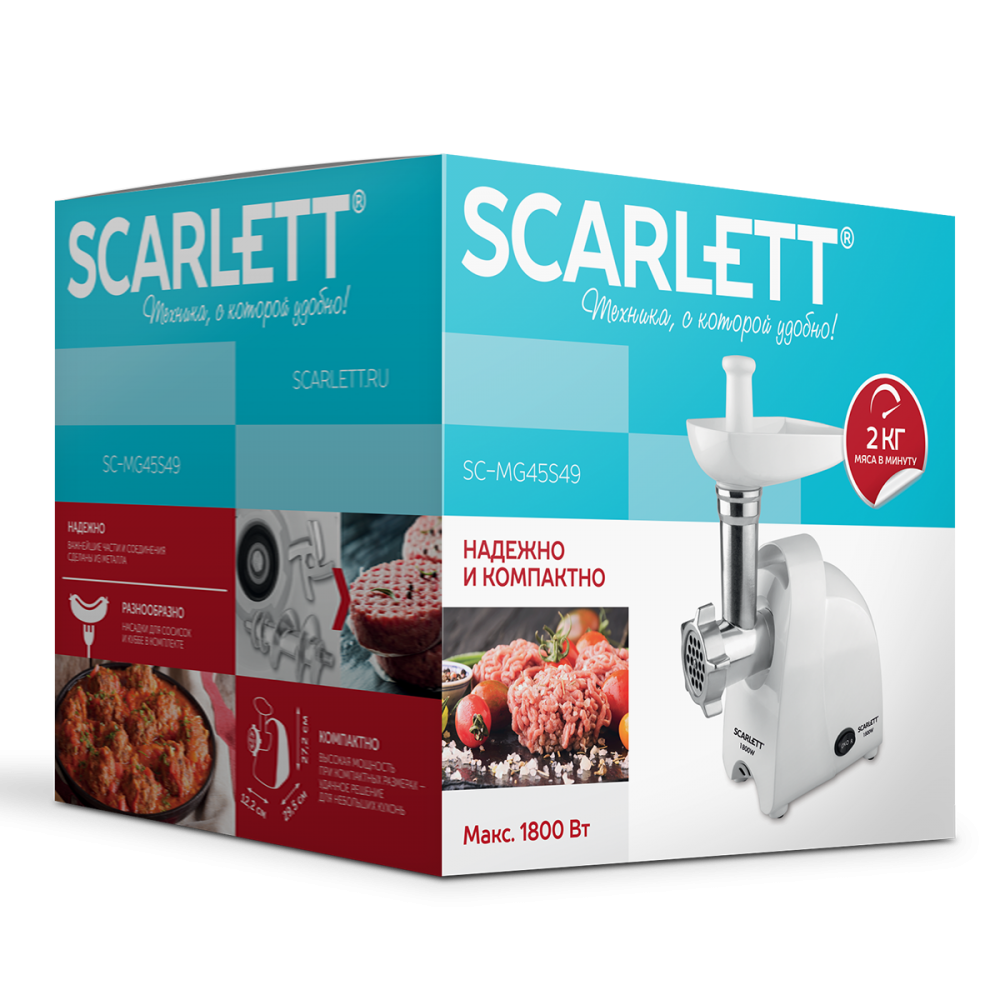 Компактная и мощная мясорубка SC-MG45S49 ― надежный помощник на Вашей кухне. Высокая мощность мотора мясорубки позволяет перерабатывать любое мясо в однородный фарш, а производительность модели достигает 2 кг/мин. В комплекте 3 насадки: перфорированная решетка с отверстиями 5 мм, насадки для кеббе и для приготовления домашней колбасы. Высокопрочный металлический шнек и нож из высококачественной нержавеющей стали обладают повышенной износостойкостью, тем самым повышая эффективность работы и продлевая срок службы прибора. Технология SAFE PRO позволяет предотвратить перегрев и перегрузку двигателя, тем самым продлевая срок его эксплуатации. Функция «Реверс» позволяет прокручивать мясо в обратном направлении, в случае если оно застряло. Прорезиненные ножки значительно облегчают процесс приготовления, благодаря им прибор устойчиво стоит на поверхности с разными покрытиями. Процесс разборки мясорубки занимает минимальное время: достаточно нажать кнопку отсоединения горловины и отделить все металлические части друг от друга. В данной модели прекрасно сочетаются компактный размер и легкий вес мясорубки, а наличие ручки позволит легко доставать и убирать прибор. Стильный и лаконичный дизайн мясорубки SC-MG45S49 идеально подойдет для Вашей кухни.