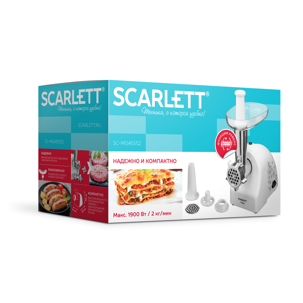 Компактная и мощная мясорубка SC-MG45S52 ― надежный помощник на Вашей кухне. Высокая мощность мотора мясорубки позволяет перерабатывать любое мясо в однородный фарш, а производительность модели достигает 2 кг/мин. В комплекте 4 насадки: 2 перфорированные решетки с отверстиями 5 и 7 мм, насадки для кеббе и для приготовления домашней колбасы. Высокопрочный металлический шнек и нож из высококачественной нержавеющей стали обладают повышенной износостойкостью, тем самым повышая эффективность работы и продлевая срок службы прибора. Технология SAFE PRO позволяет предотвратить перегрев и перегрузку двигателя, тем самым продлевая срок его эксплуатации. Функция «Реверс» позволяет прокручивать мясо в обратном направлении, в случае если оно застряло. Прорезиненные ножки значительно облегчают процесс приготовления, благодаря им прибор устойчиво стоит на поверхности с разными покрытиями. Процесс разборки мясорубки занимает минимальное время: достаточно нажать кнопку отсоединения горловины и отделить все металлические части друг от друга. В данной модели прекрасно сочетаются компактный размер и легкий вес мясорубки. Стильный дизайн мясорубки SC-MG45S52 идеально подойдет для Вашей кухни.