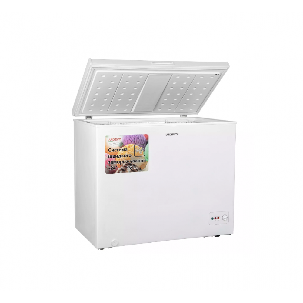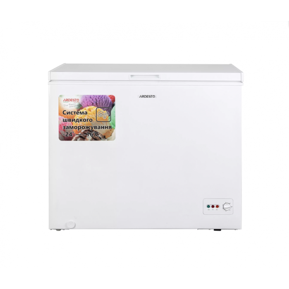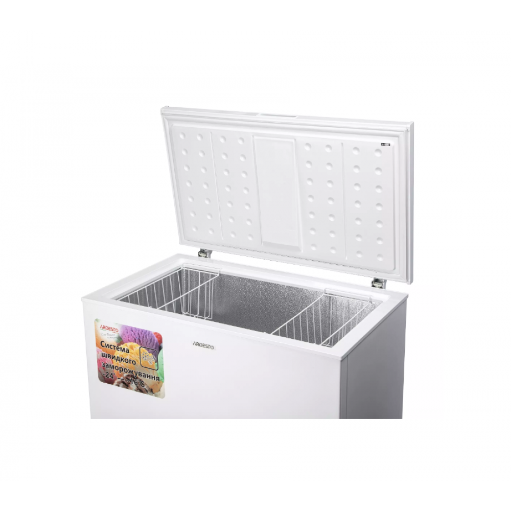 FRM-250MCH — средняя модель в линейке морозильных камер Ardesto с механическим управлением. Высота камеры —85 см, ширина — 98.5 см, а вес составляет 36 кг. Это оптимальный размер для домохозяйств и магазинов средних размеров. Полное открытие крышки позволяет легко контролировать внутреннее пространство камеры.