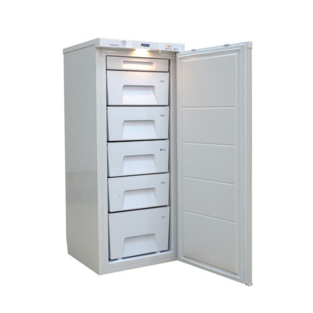 Выдвижные ящики изготовлены из прочного пластика, устойчивого к механическим повреждениям и выдерживающего значительный вес. Объем морозильной камеры Pozis FV 115 составляет 160 л, чего достаточно для одновременного размещения большого количества мяса и рыбы.