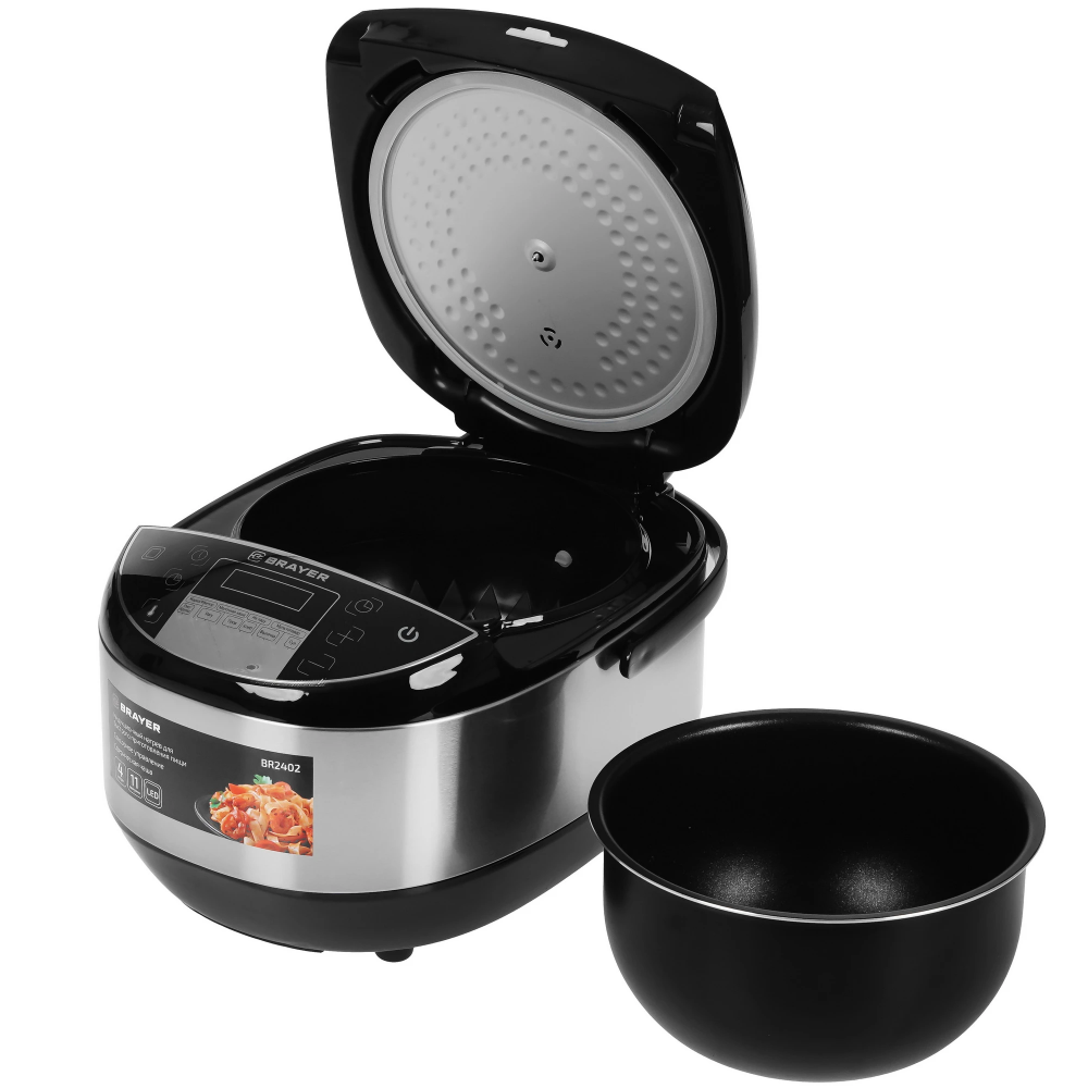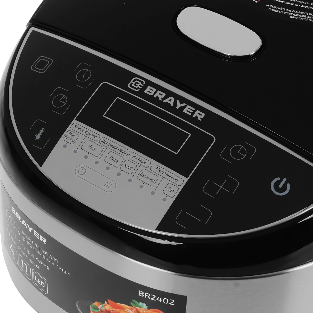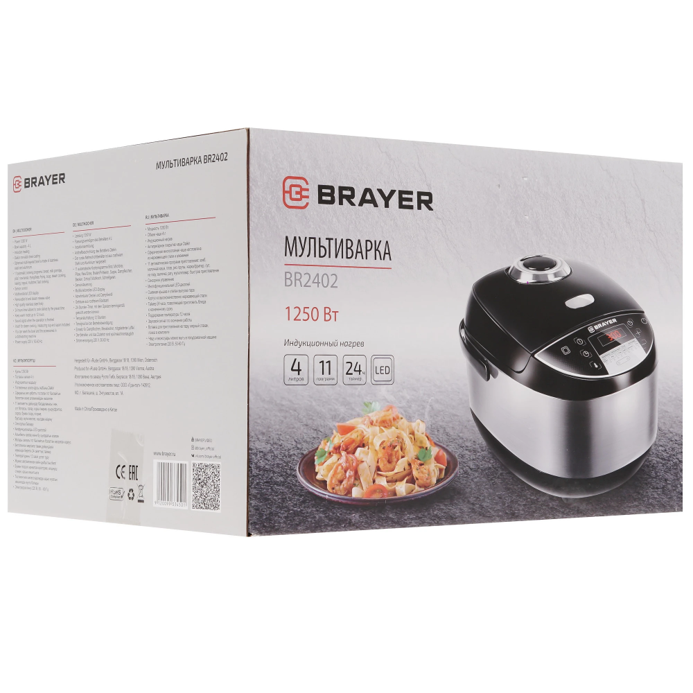 Brayer BR2402 оснащена 11 автоматическими программами для приготовления разных блюд. Есть возможность ручной настройки температуры и времени готовки. Мультиварка дополнена функцией подогрева в течение 12 ч с возможностью отключения. Устройство идет в комплекте с мерным стаканом для точного соблюдения рецептуры, плоской ложки для перемешивания и корзиной для приготовления блюд на пару.