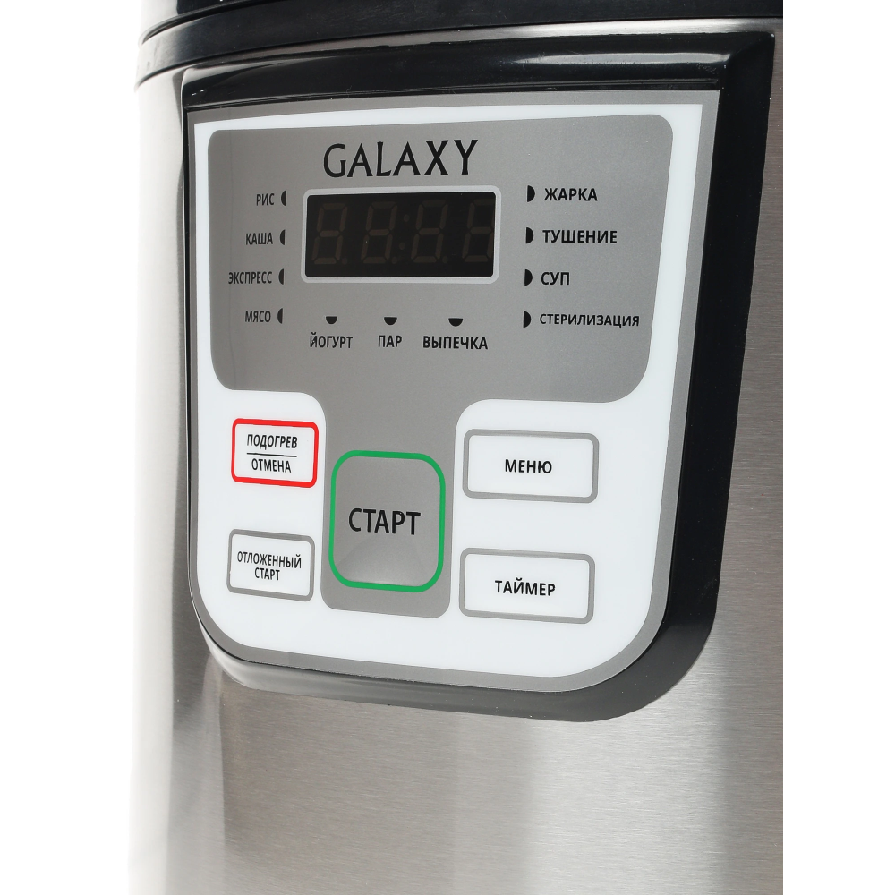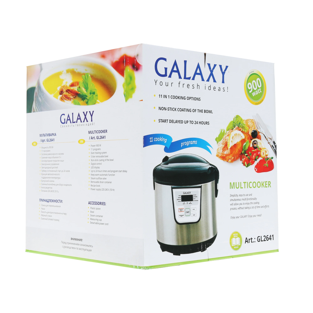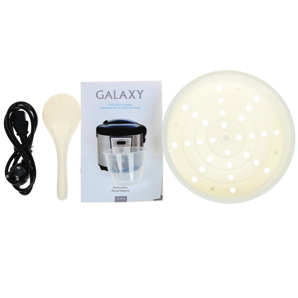 Мультиварка Galaxy GL2641 оборудована 5-литровой чашей, имеющей антипригарное покрытие. Удобству управления устройством способствует наличие светодиодного дисплея. Особенностью модели является система равномерного нагрева. В комплектацию мультиварки включены решетка для приготовления на пару, мерный стакан, мерная ложка и инструкция по эксплуатации. Дизайн корпуса мультиварки оформлен с помощью черного и серебристого цветов. Модель упакована в стильную коробку, имеющую привлекательный вид.