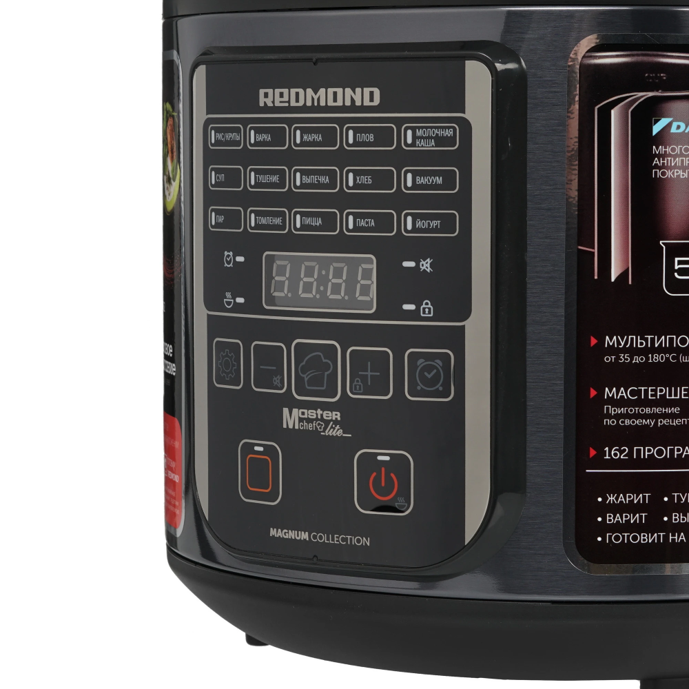 Redmond RMC-M52 оснащена алюминиевой чашей с полезным объемом 3.5 л. Антипригарное покрытие DAIKIN не дает продуктам пригорать даже при небольшом количестве растительного масла. При наличии в доме маленьких детей вы можете отключать звуковые сигналы и блокировать панель управления.