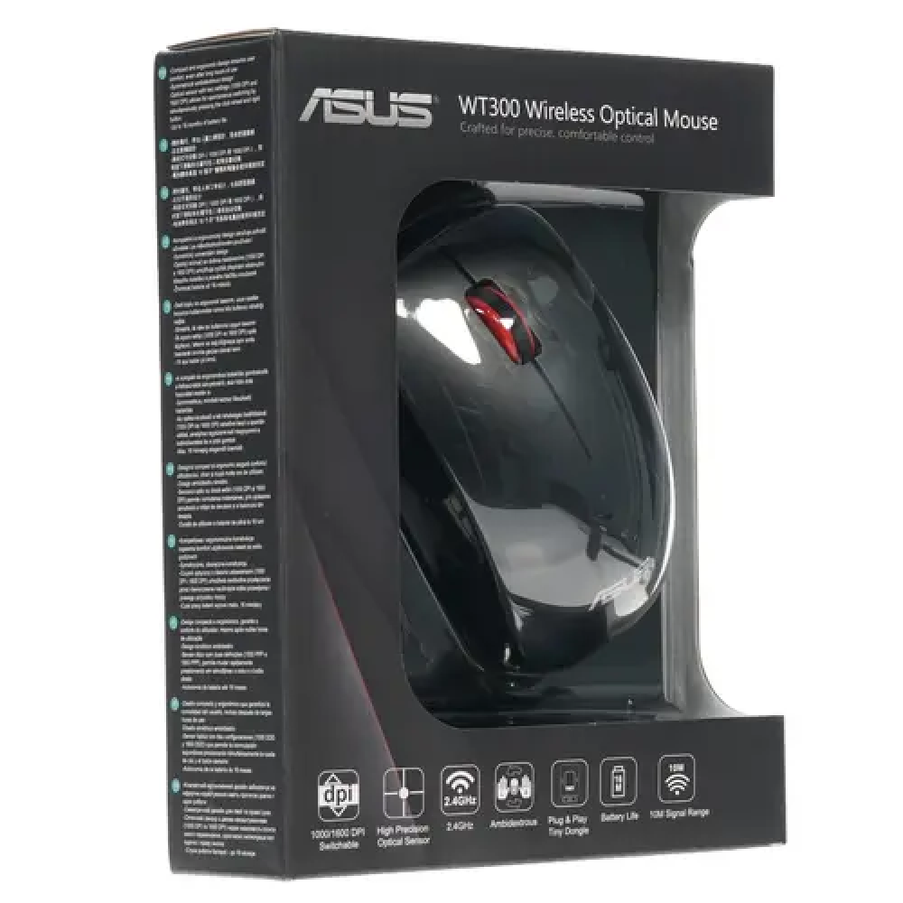 Конструкция устройства ASUS WT300 позволяет работать с мышкой правой или левой рукой. Прибор оснащен прочным пластиковым корпусом, обладающим нескользящим матовым покрытием. Устройство подключается к ПК при помощи беспроводного USB-адаптера, а для работы самой мышки потребуется наличие одной пальчиковой батарейки (AA), полного заряда которой хватит на 15 месяцев. Поставка осуществляется вместе с ресивером и элементом питания.