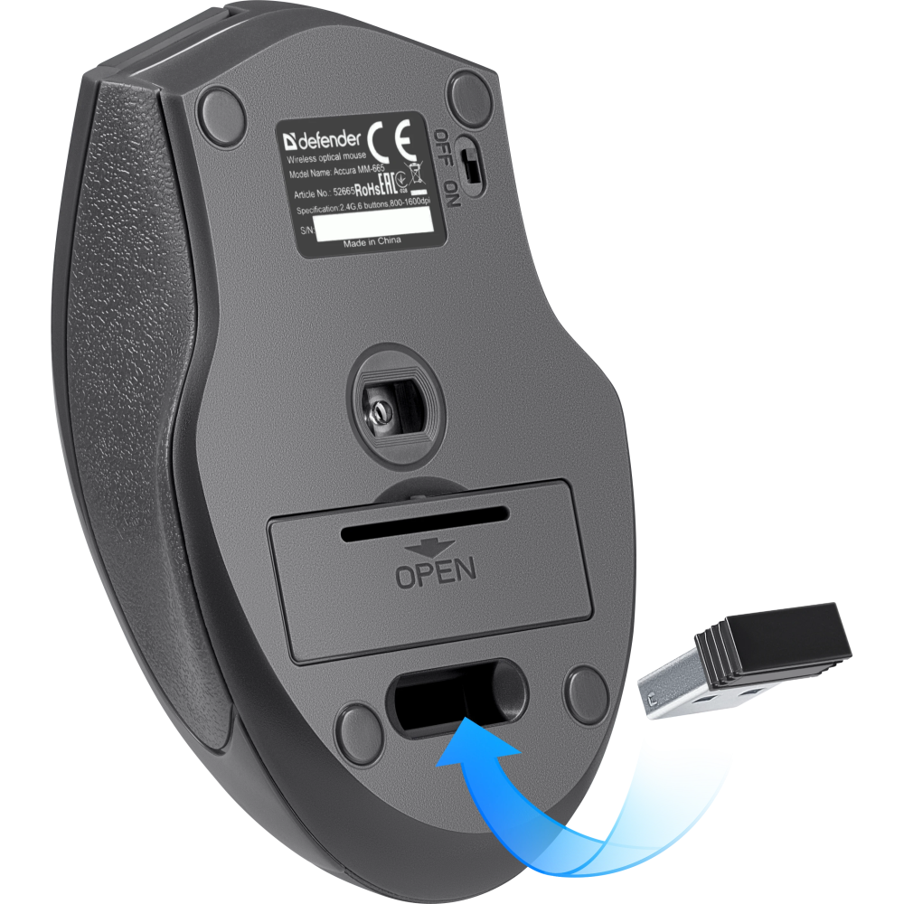 Defender Accura MM-665 оснащена светодиодным датчиком, обладающим разрешением 1600 dpi. Возможность работы в нескольких режимах датчика позволяет настроить мышь под особенности работы на компьютере: для игр можно настроить максимальное значение разрешения, а для офисной работы − среднее. Беспроводной манипулятор поставляется с ресивером USB, подключаемым к порту ПК и обеспечивающим стабильное соединение на дистанции 10 м.