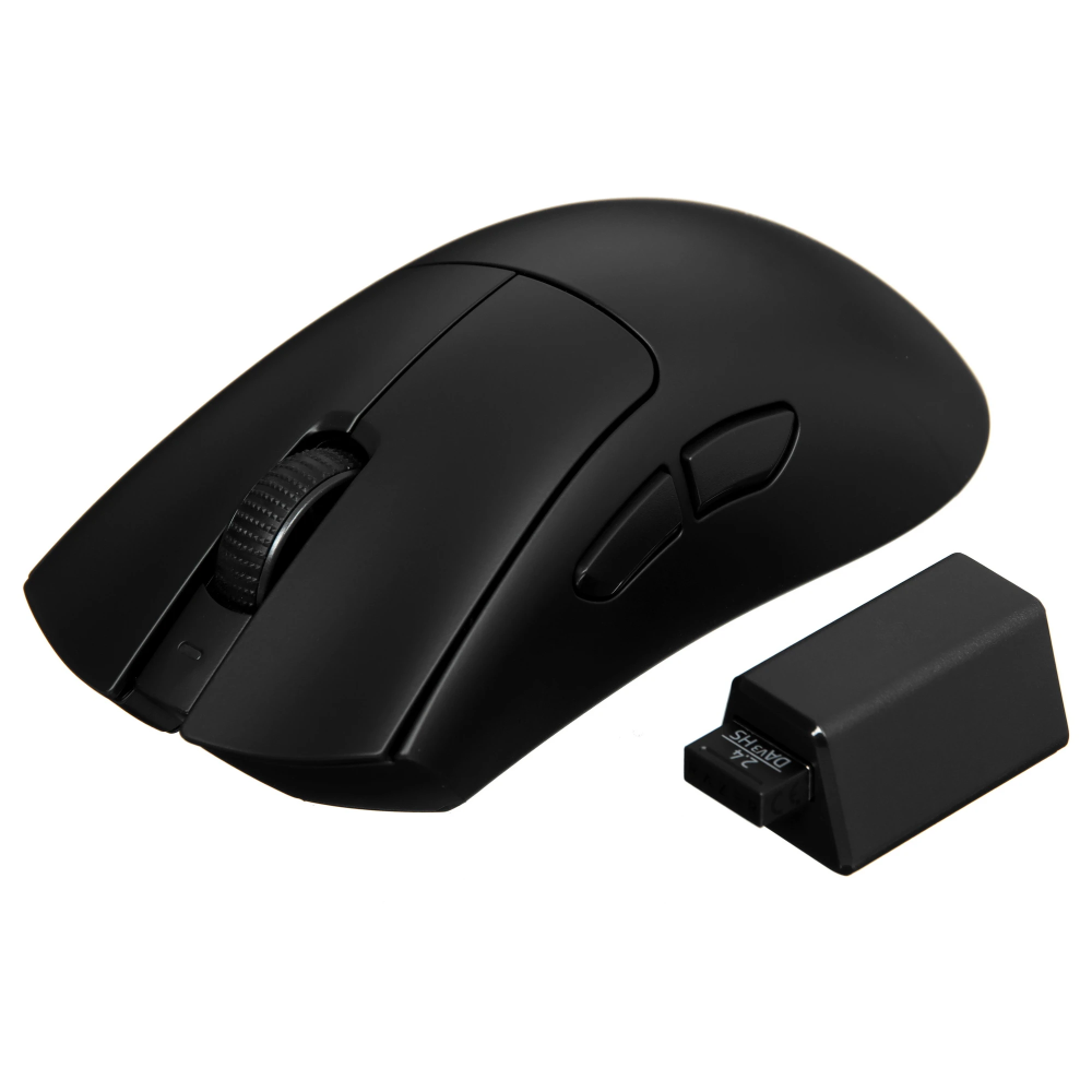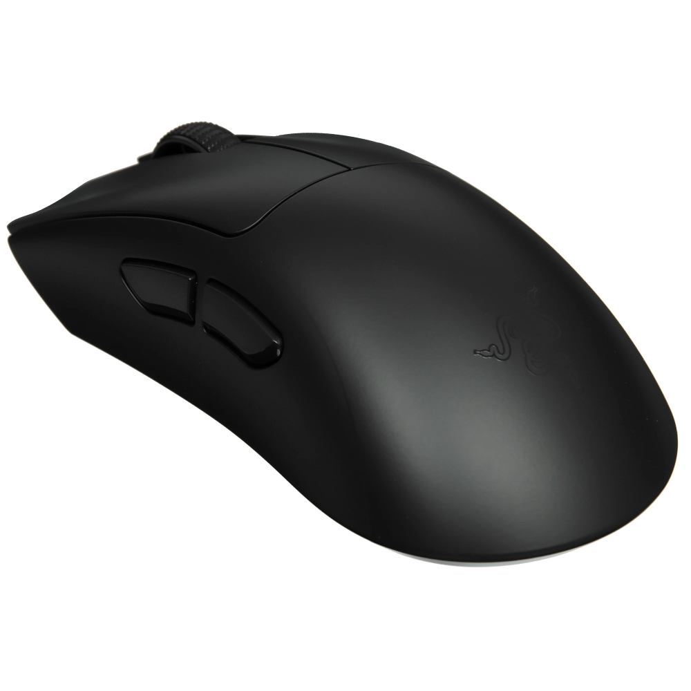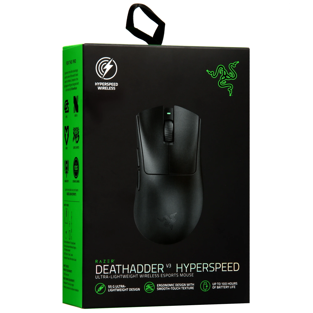 Razer DeathAdder V3 HyperSpeed (RZ01-05140100-R3G1) заключена в черный пластиковый корпус, форма которого удобна для управления правой ладонью. Энергия аккумулятора рассчитана на 100 ч автономной работы аксессуара. Проводное подключение осуществляется с помощью 1.8-метрового USB-кабеля.