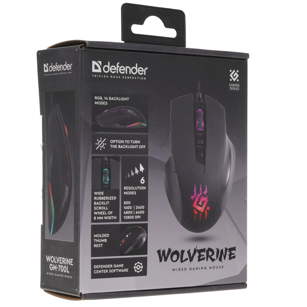 Проводная мышка Defender Wolverine GM-700L имеет шесть кнопок и колесико в своем оснащении, включая кнопку смены разрешения датчика. В устройстве используется оптический светодиодный сенсор, максимальное разрешение которого соответствует 12800 dpi. Питание данная модель получает по шине.