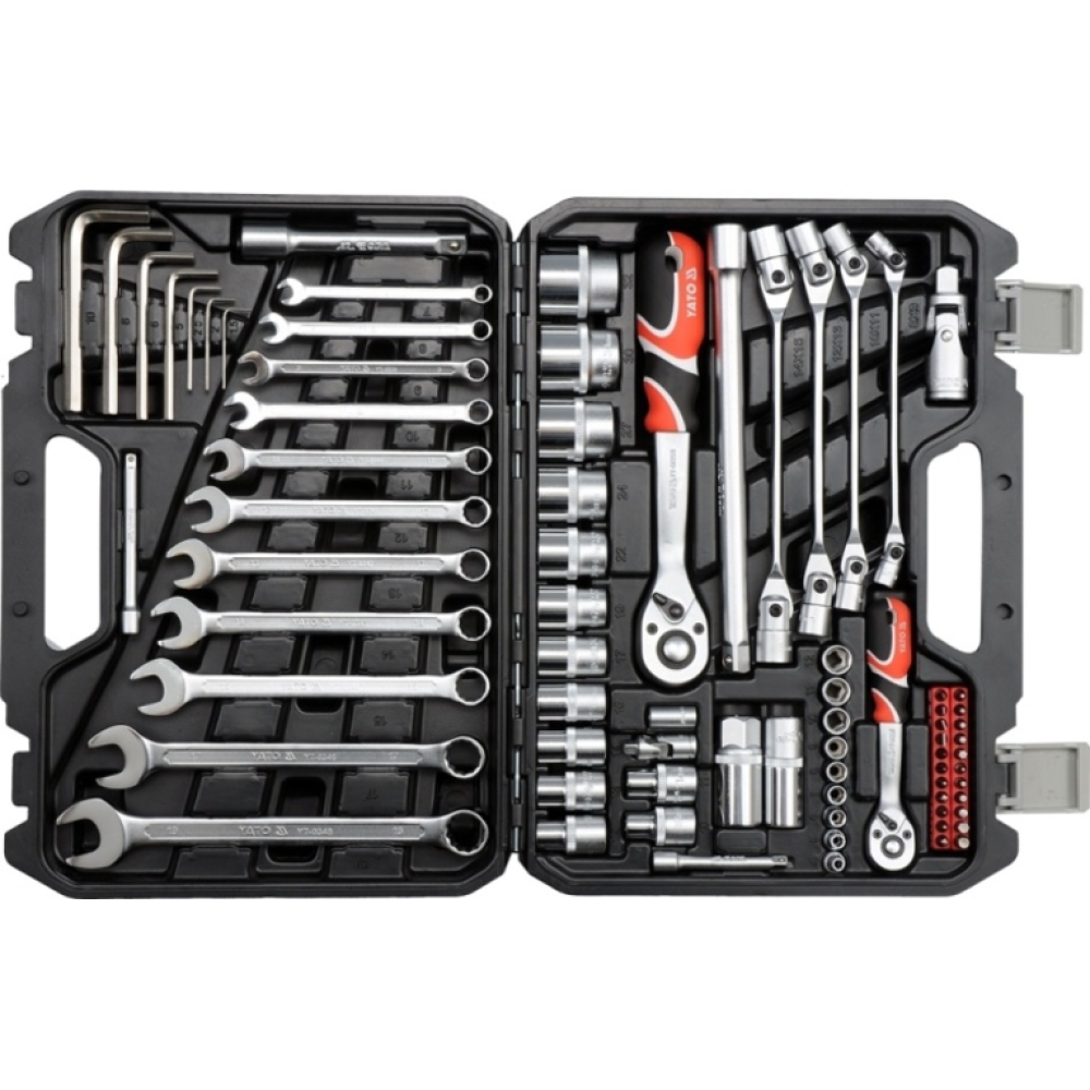 Универсальный набор инструментов YATO YT-38781 включает 77 предметов и предназначен для широкого спектра работ, от ремонта автомобилей до бытовых задач. В комплекте представлены торцевые головки с посадочным размером 1/4" и 1/2" (включая короткие и длинные), два типа трещоток (1/4" и 1/2" с 72 зубьями для точной работы), удлинители, карданные шарниры, свечные головки, а также набор бит различных профилей (PH, PZ, SL, Torx, HEX). Дополнительно в набор входят комбинированные ключи и шестигранные ключи. Все инструменты изготовлены из высококачественной хромованадиевой стали CrV 50BV3, что обеспечивает их прочность, долговечность и устойчивость к высоким нагрузкам и коррозии. Набор поставляется в прочном пластиковом кейсе, который обеспечивает удобное хранение, порядок и защиту инструментов при транспортировке.