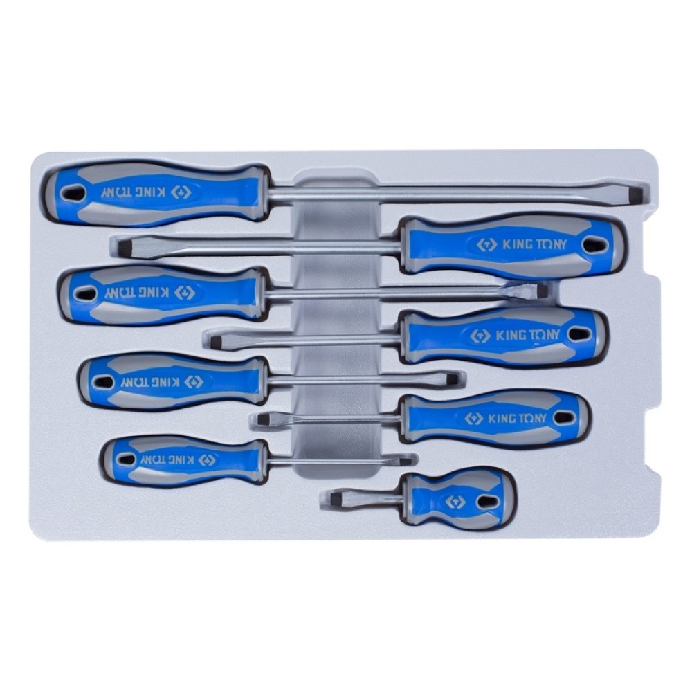 Набор отверток в коробке 8шт KING TONY 30118MR служит для проведения ремонтных, сборочных или демонтажных работ с применением плоских винтов. Изделия имеют эргономичные, нескользящие рукоятки и прочные стальные стержни, защищенные от коррозии.