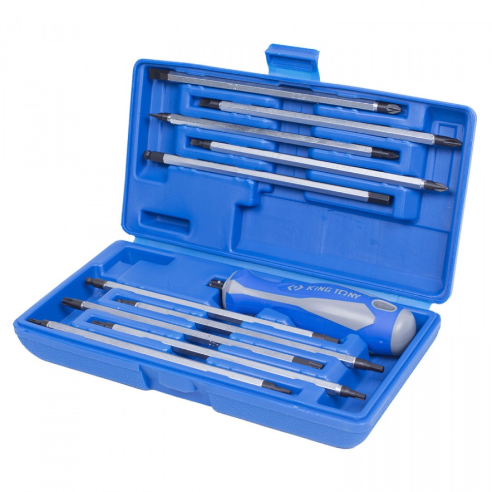 Набор отвертка со сменными вставками-битами KING TONY 11 предметов 32518MR предназначен для монтажа и демонтажа крепёжных узлов различных изделий, устройств и агрегатов. Инструмент выполнен из качественной легированной стали с добавлением молибдена, что обеспечивает прочность, надежность и долговечность. Эргономичная рукоятка из TPR пластика обеспечивает надежный хват и комфортное вращение. Инструмент поставляется в удобном пластиковом кейсе для рационального хранения и транспортировки.
