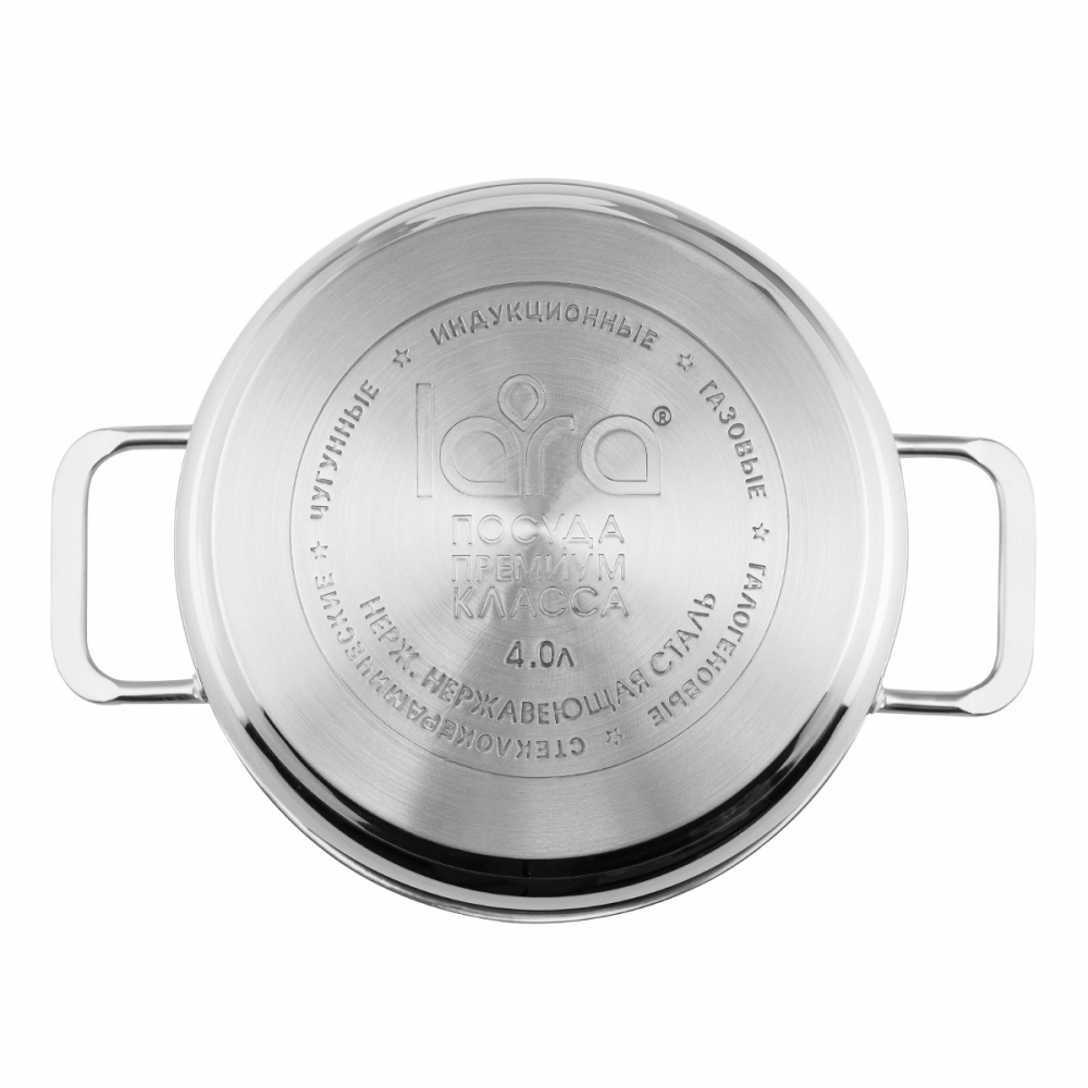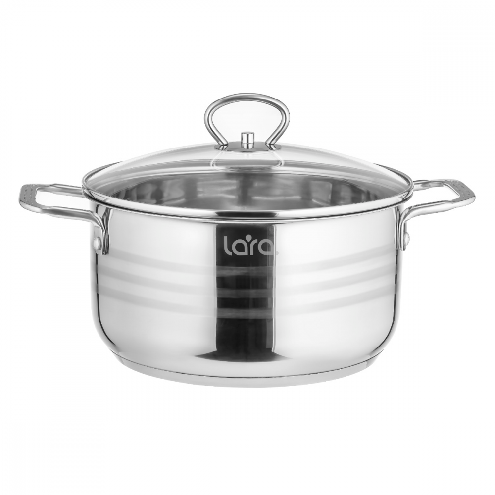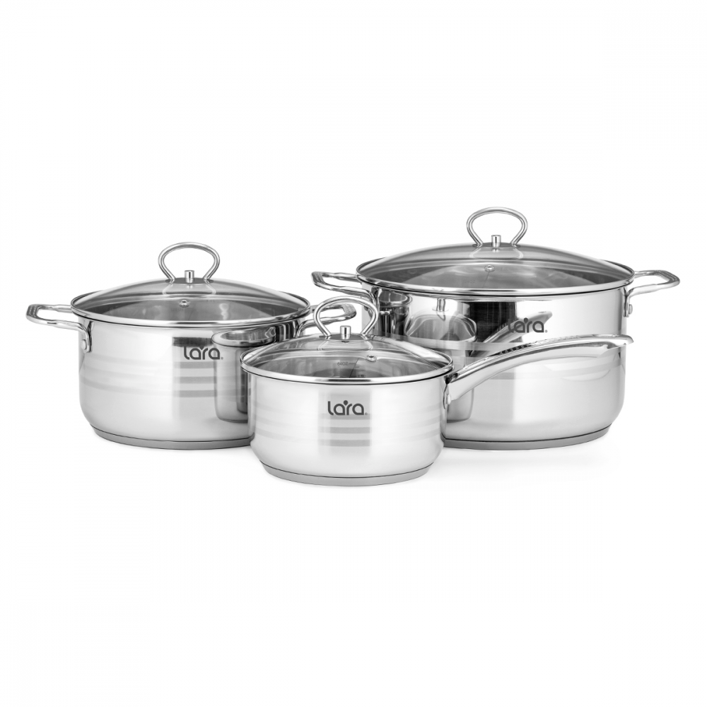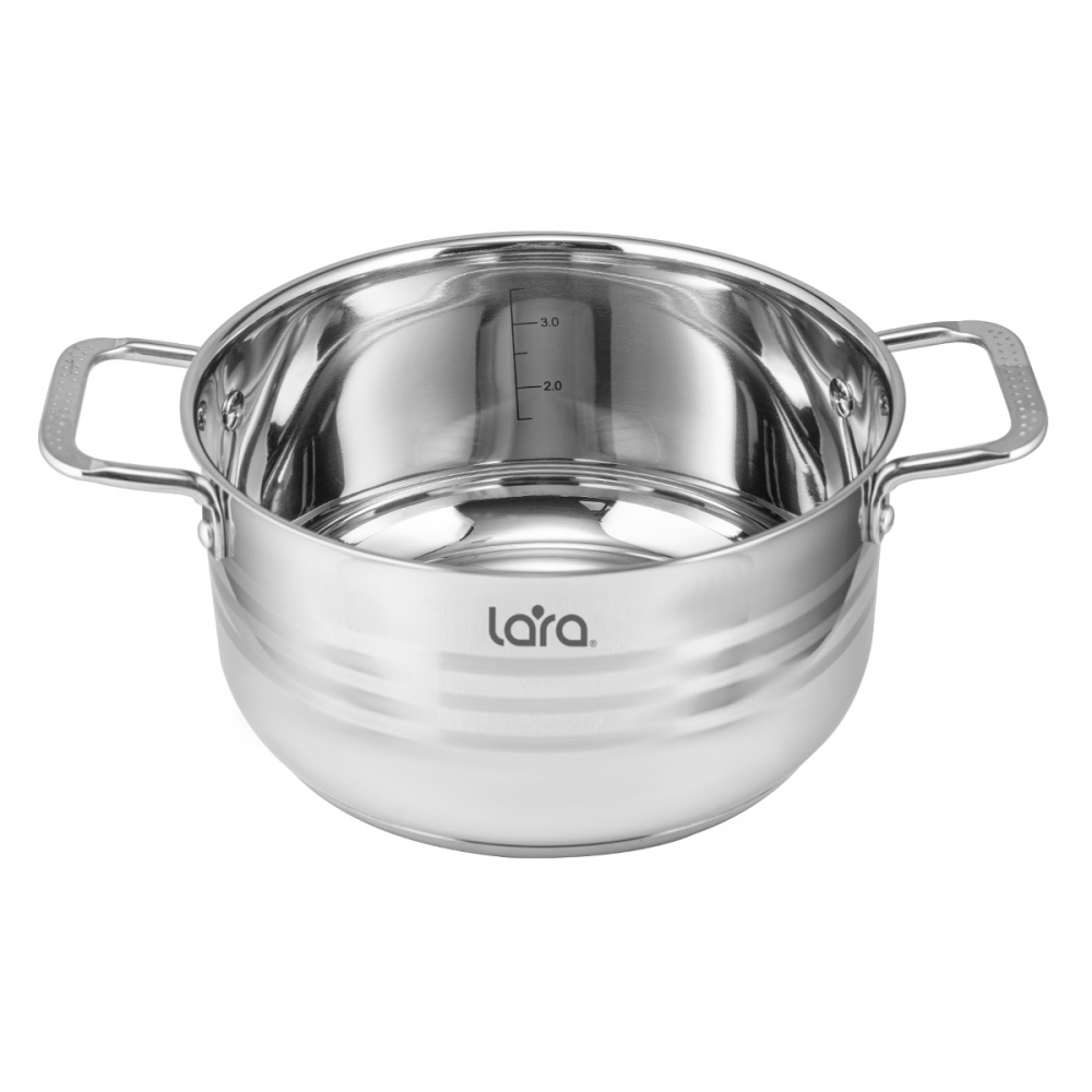 Набор кастрюль LARA серии “STANDART” с сотейником станет верным помощником на Вашей кухне. Зеркальная полировка корпуса с тремя матовыми полосами придают изделиям законченный внешний вид и делают их стильными элементами интерьера. Внутренняя мерная шкала для соблюдения рецептуры. Кастрюли произведены из высокоуглеродистой нержавеющей стали AISI201. Крышка изготовлена из жаропрочного стекла с паровыпуском, стальной ненагревающейся ручкой и ободом G-формы, плотно прилегающим к стенкам. Полые ненагревающиеся ручки на прочных заклёпках. Стальное индукционное капсулированное дно подойдёт для всех типов плит. Можно мыть в посудомоечной машине.