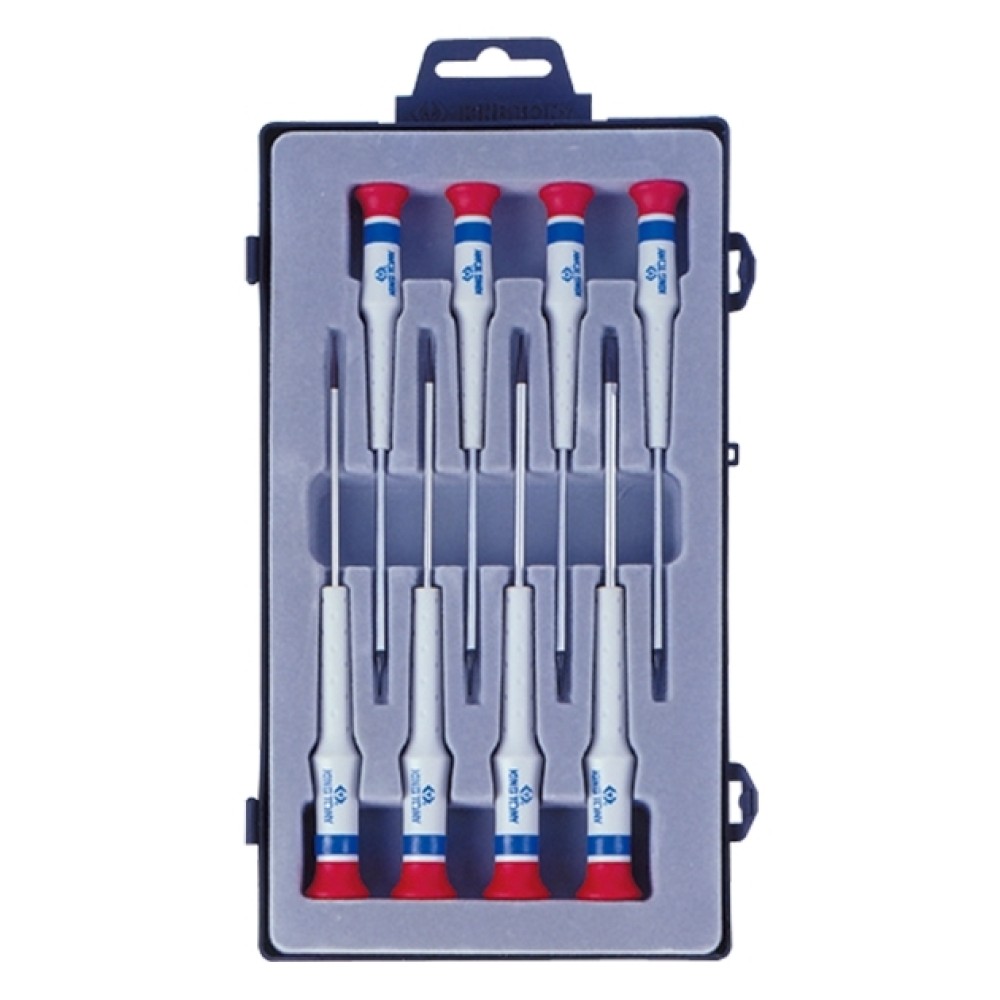 Набор прецизионных отверток (8 предметов) KING TONY 32118MR используются для работы с мелким крепежом - например, при ремонте сотовых телефонов. Все инструменты размещаются в индивидуальных отсеках футляра и не смешиваются в процессе транспортировки. Специальная выемка в середине ложемента облегчает извлечение отверток.
