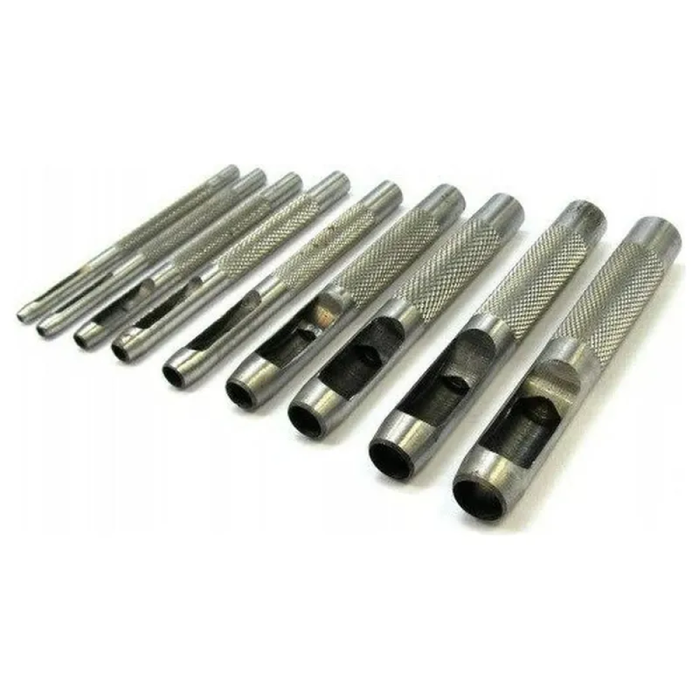 Набор из 9 пробойников (0 – 10 мм) TOLSEN, выполненных из закалённой углеродистой стали. Диаметры: 2,5; 3; 4; 5; 6; 7; 8; 9 и 10 мм. Инструменты упакованы на блистер‑карточке, предназначены для пробивки отверстий в коже, резине, пластике, холсте и прочих мягких материалах