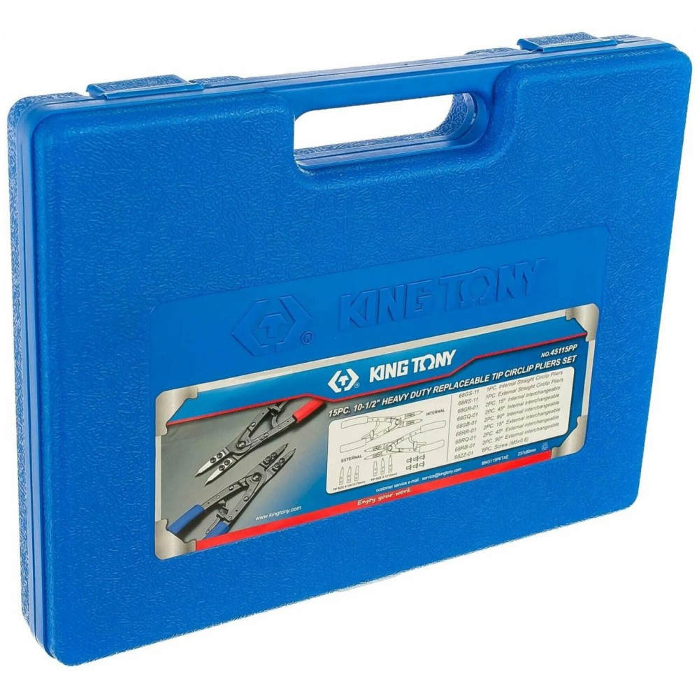 Набор съёмников стопорных колец **45115PP** предназначен для точной и удобной установки и демонтажа внутренних и наружных стопорных колец различного диаметра. В комплект входят 4 высококачественных съёмника: два с прямыми губками (для внутренних и наружных колец) и два с изогнутыми губками под углом 90° (также для внутренних и наружных колец). Рабочие части инструментов изготовлены из прочной хром-ванадиевой стали, обеспечивающей долговечность, износостойкость и устойчивость к нагрузкам. Эргономичные ручки с двухкомпонентным антискользящим покрытием обеспечивают надёжный хват и комфорт при длительной работе. Набор удобно размещён в прочном пластиковом кейсе, который защищает инструменты при хранении и транспортировке. Комплект идеально подойдёт для автомехаников, сервисных центров и технических специалистов.