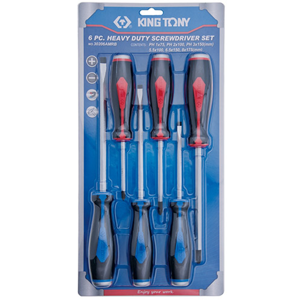 Набор силовых отверток 6шт KING TONY 30206MRB используется для монтажно-демонтажных работ с трудноподдающимся, прикипевшим крепежом крестового и плоского профиля. Каждая отвертка оснащена удобной для обхвата ручкой из двухкомпонентного материала. Для удобства хранения в комплекте предусмотрен ложемент с отдельными ячейками.