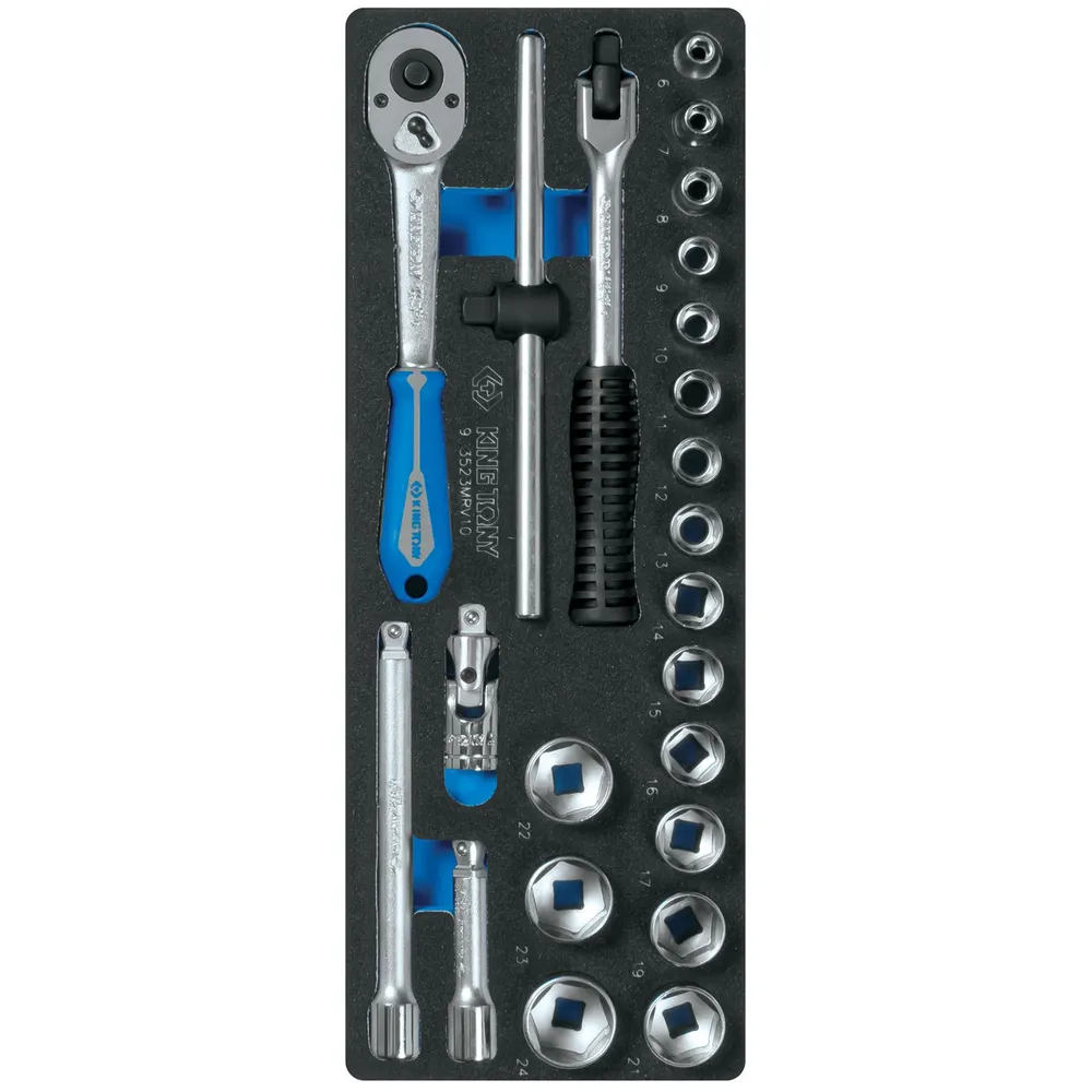 Профессиональный набор головок и аксессуаров KING TONY 9-3523MRV10 — компактный и надёжный комплект для автослесарей, механиков и сервисных мастеров. Изготовлен из высококачественной хром-ванадиевой стали и размещён в удобном ложементе с точной формовкой EVA