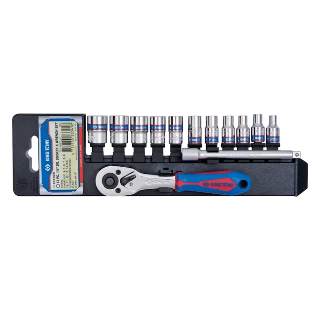 Набор King Tony 2313MR серый — это комплект из 13 торцевых 6‑гранных головок размером 4 – 14 мм под 1/4″ квадрат. Компактные и удобные, головки выполнены из хром‑ванадиевой стали, имеют короткий корпус (около 24 мм) с глубиной посадки до 9 мм. В комплект добавлена трещотка 2766‑55G и удлинитель 100 мм — всё размещено на холдере для удобства хранения и переноса. Весит около 420 г. Подходит для работы с крепежом в быту, автосервисе и мастерской. Соответствует международным стандартам DIN и ISO, с гарантийным сроком 12 мес. в розницу (или пожизненно от King Tony при профессиональной эксплуатации).