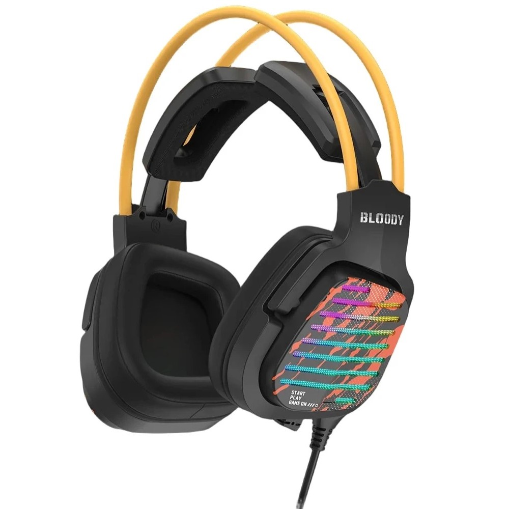A4Tech Bloody G565 с системой виртуального объемного звучания 7.1 помогает погрузиться в захватывающий игровой процесс. В ней установлены мощные 50-мм динамики, которые формируют детализированный и насыщенный звук. Микрофон с функцией шумоподавления, расположенный на корпусе наушников, отвечает за передачу чистого голоса без искажений. Эргономичное регулируемое оголовье гарантируют комфорт прослушивания в течение целого дня. Большие и удобные амбушюры из экокожи с эффектом памяти обеспечат вашим ушам максимальное удобство. Чаши украшены элементами многоцветной подсветки, которая настраивается в зависимости от предпочтений пользователя. A4Tech Bloody G575 подключается посредством USB-кабеля.