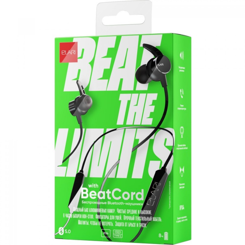 Bluetooth-стереогарнитура ELARI BeatCord черного цвета имеет небольшой размер и вставную конструкцию, что обеспечивает комфортные условия эксплуатации во время активных занятий спортом, пробежек, прогулок и других действий. Высокопрочный корпус устойчив к попаданию влаги и пыли, поэтому надолго сохраняет первоначальный вид без потери качеств звучания.