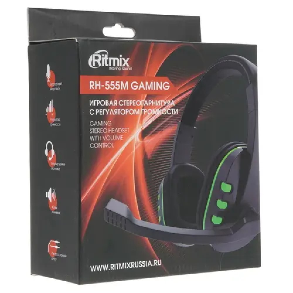 Подключение RITMIX RH-555M осуществляется при помощи двойного разъема Jack 3.5 мм. Благодаря этому модель может использоваться как с ПК и ноутбуками, так и с игровыми приставками и другими мультимедийными устройствами. Для дополнительного удобства использования провод обладает длиной 2 м и оборудован регулятором громкости. Гарнитура поставляется в фирменной упаковке.