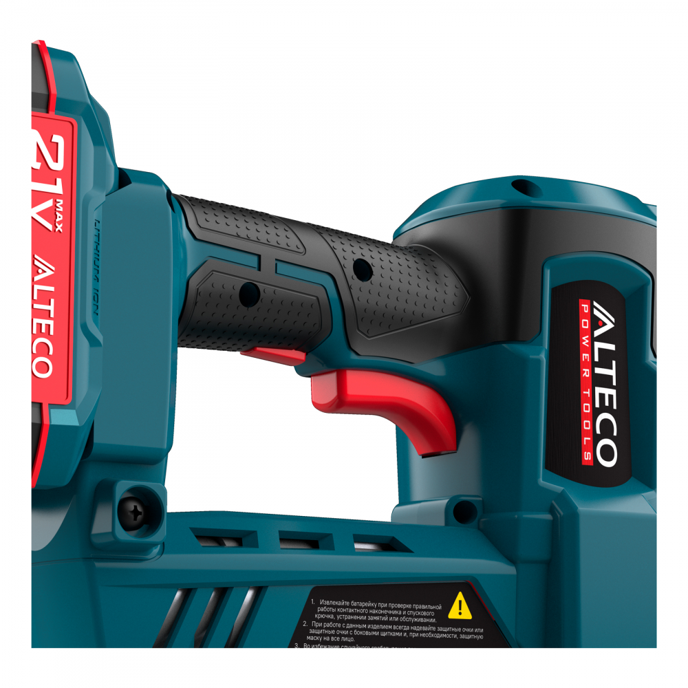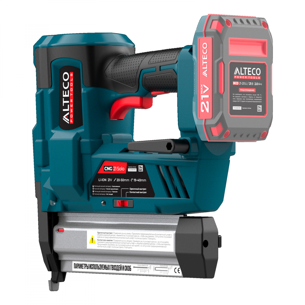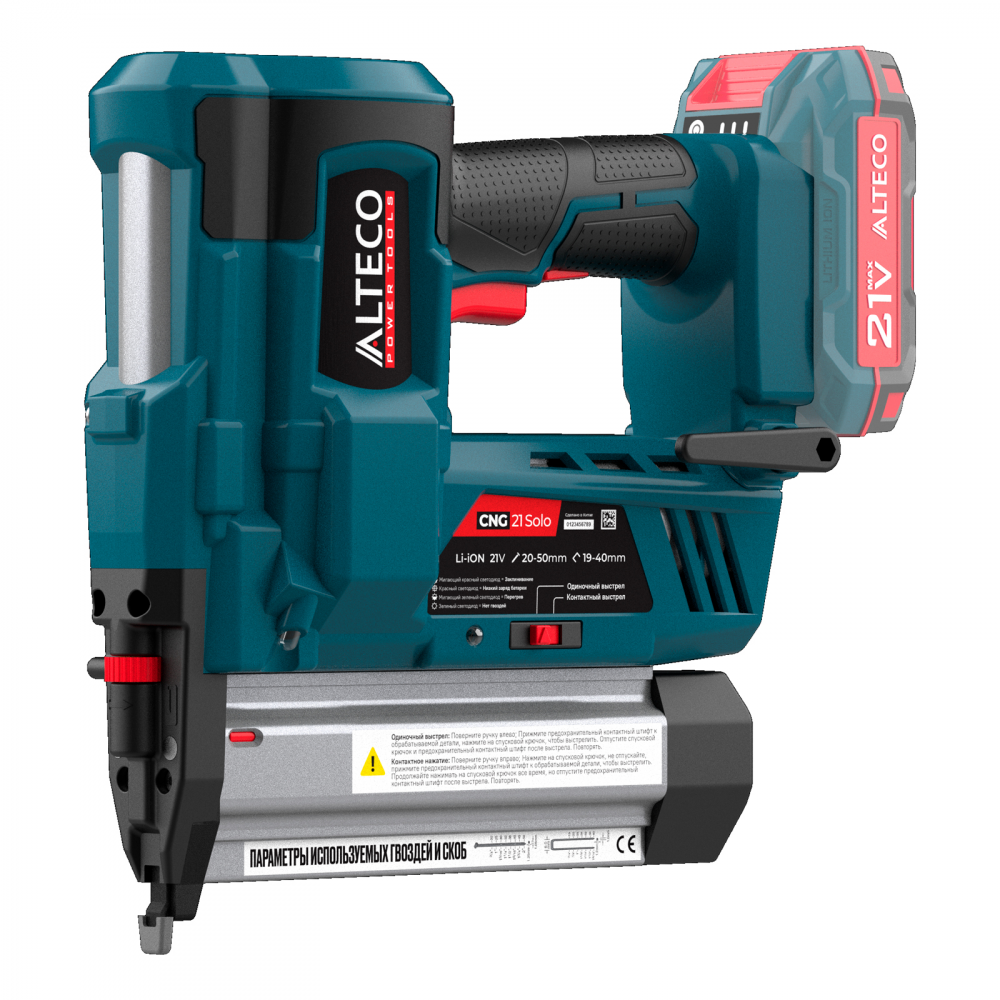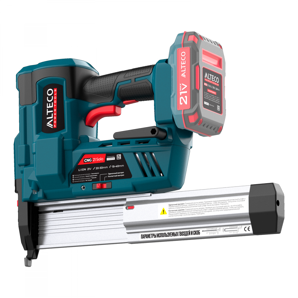 Аккумуляторный гвоздескобозабивной пистолет ALTECO CNG 21 Solo (без АКБ И ЗУ) это портативный инструмент, который используется для удобного и быстрого забивания гвоздей, скоб или штифтов в различных материалах, таких как дерево, пластик, мягкий металл и другие. Он работает от аккумуляторного питания, что обеспечивает мобильность и удобство использования без привязки к электрической розетке.