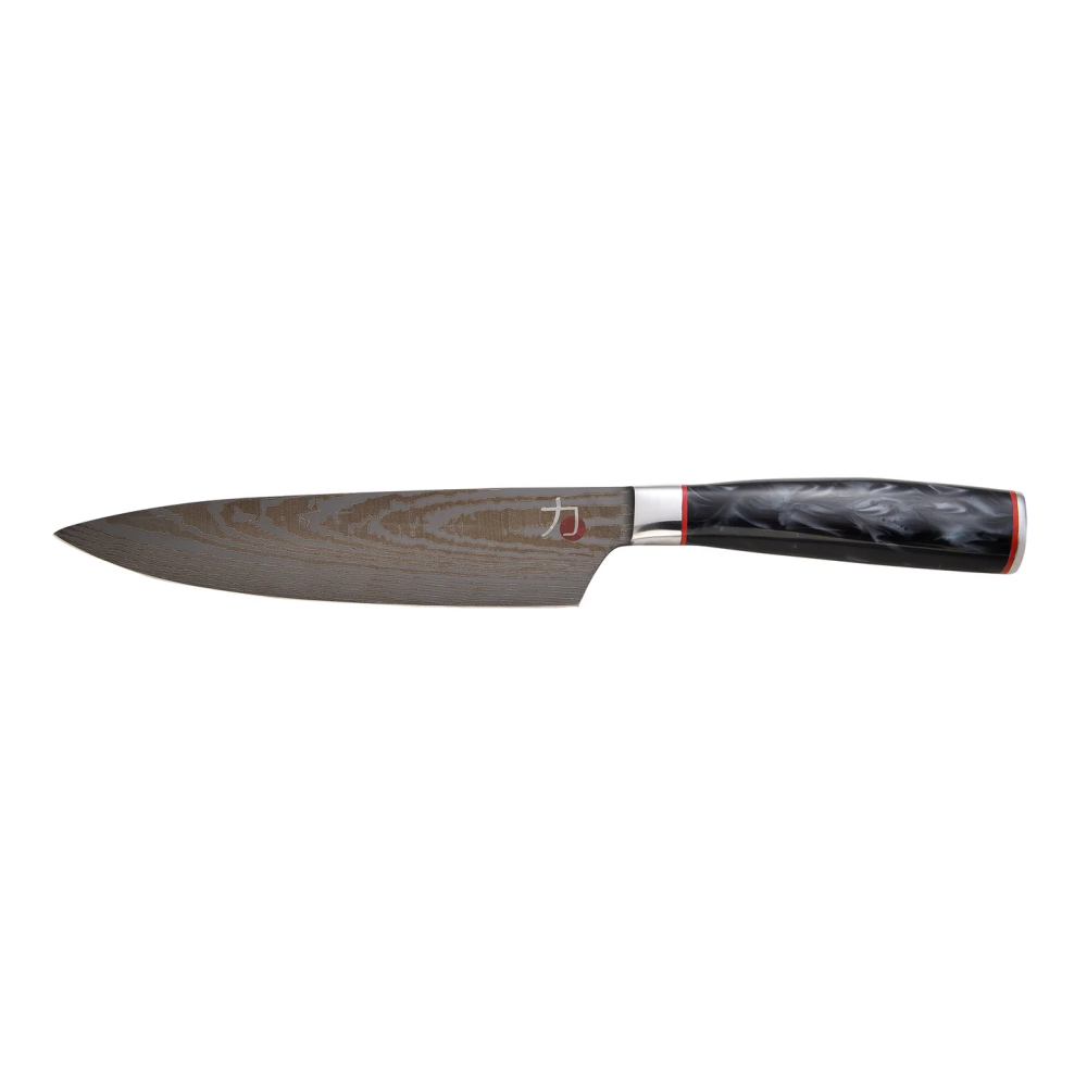 Интегрированное защитное кольцо, которое не допускает соскальзывание пальца на острие ножа, а в горизонтальном положении удерживает лезвие на весу, предотвращая контакт с поверхностью стола.