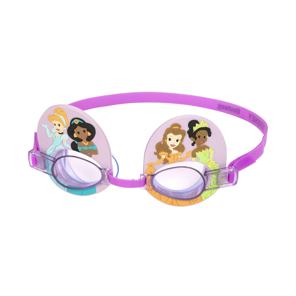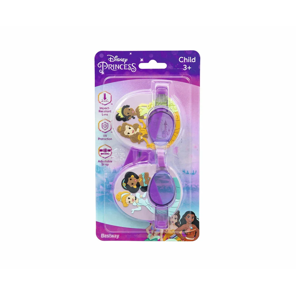 Очки для плавания Essential, BESTWAY, 9102U, Пластик, 3+, Disney Princess, Фиолетовые, БлистерПодарите своему ребенку удовольствие от погружения под воду с его любимыми очками для плавания Disney® Princess! Очки для плавания, идеально подходящие для детей от 3 лет, украшены изображениями ваших любимых принцесс Диснея на внешней стороне оправы. Ударопрочные линзы с УФ-защитой: Очки Disney Princess имеют цветные ударопрочные линзы из поликарбоната с УФ-защитным покрытием, которые защищают глаза ваших детей от солнца, а также выдерживают обычные удары и падения на террасу бассейна. Удобная посадка: Благодаря мягким удобным наглазникам, регулируемой переносице и силиконовому ремешку эти невероятно забавные очки для плавания позволяют легко подобрать правильную посадку, чтобы ваш ребенок мог дольше наслаждаться по-королевски веселым приключением, не прибегая к постоянным регулировкам. Каждый солнечный день будет наполнен брызгами и смехом благодаря очкам для плавания Disney Princess! Цветные ударопрочные линзы из поликарбоната с защитным покрытием от ультрафиолетовых лучей Мягкие, удобные наглазники Регулируемая переносица и силиконовый ремешок Не содержащие латекс материалы В комплект входит: 1 пара очков