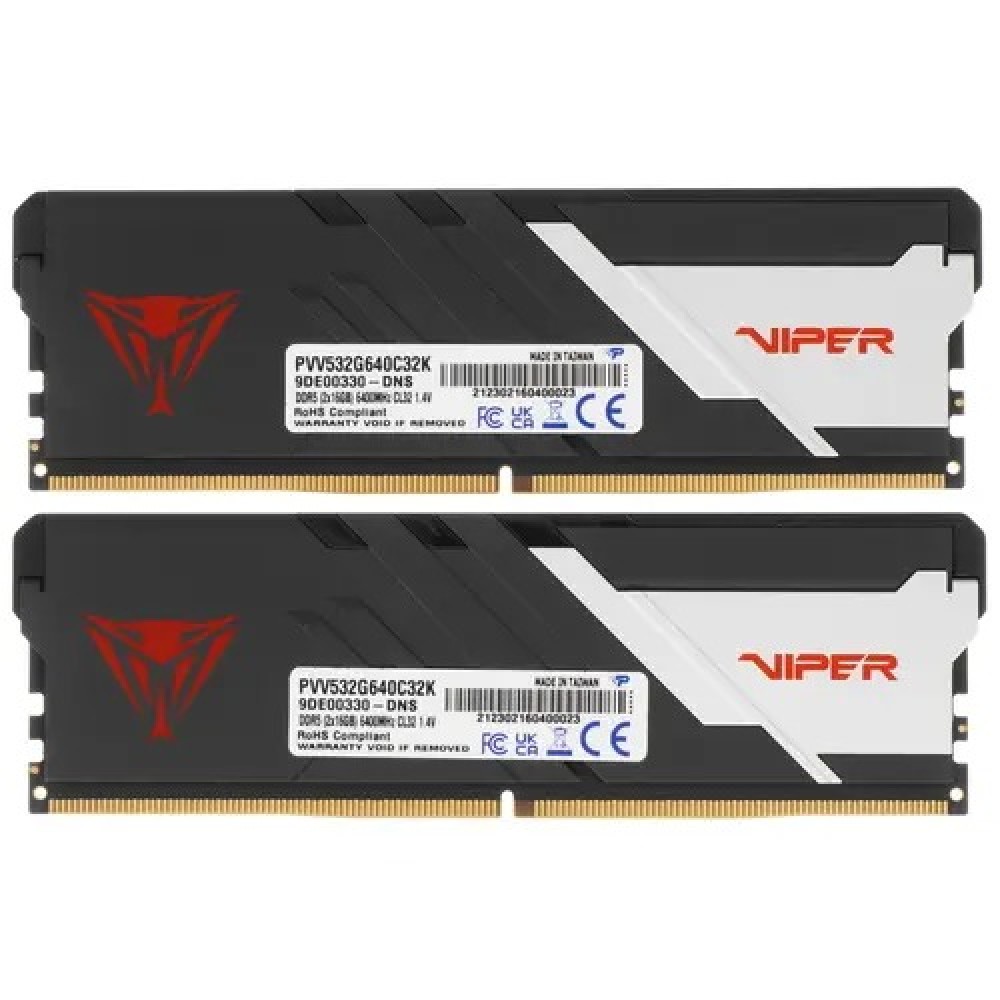 Оперативная память Patriot Viper Venom – стильное и мощное решение для игрового компьютера. Она обеспечивает высокое быстродействие аппаратной платформы, низкие задержки и плавное отображение динамичной графики. В комплекте поставляются два модуля стандарта DDR5 с общим объемом 32 ГБ и тактовой частотой 6400 МГц. Внешне они примечательны стилизованными алюминиевыми радиаторами с комбинированной расцветкой. Совместно с интегральной схемой управления питанием радиаторы эффективно отводят тепло и поддерживают стабильную температуру планок Patriot Viper Venom.