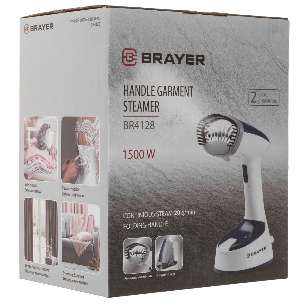 Отпариватель BRAYER BR4128 с постоянной подачей пара 20 г/мин справляется с разглаживанием складок на деликатных и плотных тканях. Насадка-щетка удаляет шерсть и ворсинки. Складная ручка делает прибор удобным при хранении и транспортировке.