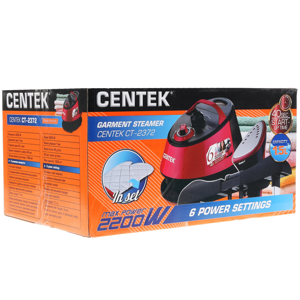 Напольный отпариватель Centek CT-2372 — это мощное и эффективное устройство для ухода за вашей одеждой. С максимальной мощностью 2200 Вт и подачей пара до 45 г/мин, он обеспечивает быстрое и качественное отпаривание. Готовность к работе достигается всего за 40 секунд. Объем резервуара для воды составляет 1.5 литра, что позволяет проводить несколько сеансов отпаривания без необходимости частого долива воды. Длина сетевого шнура — 1.7 м, что обеспечивает удобство в использовании. Корпус выполнен из прочного пластика малинового цвета, а рабочая поверхность оснащена стальной подошвой для равномерного распределения пара.